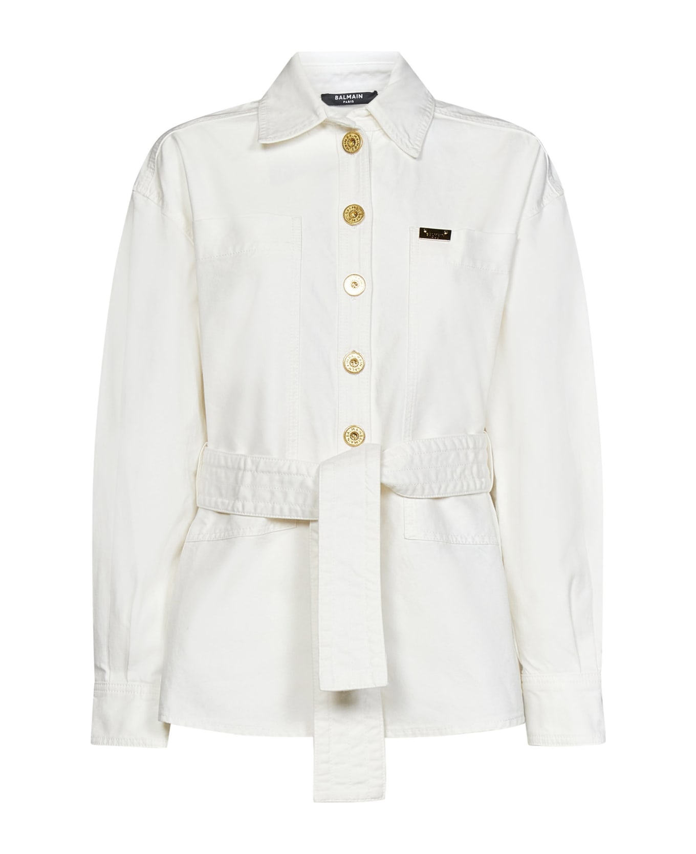 Pointed collar; Long sleeves, dropped shoulders, buttoned cuffs with golden embossed buttons