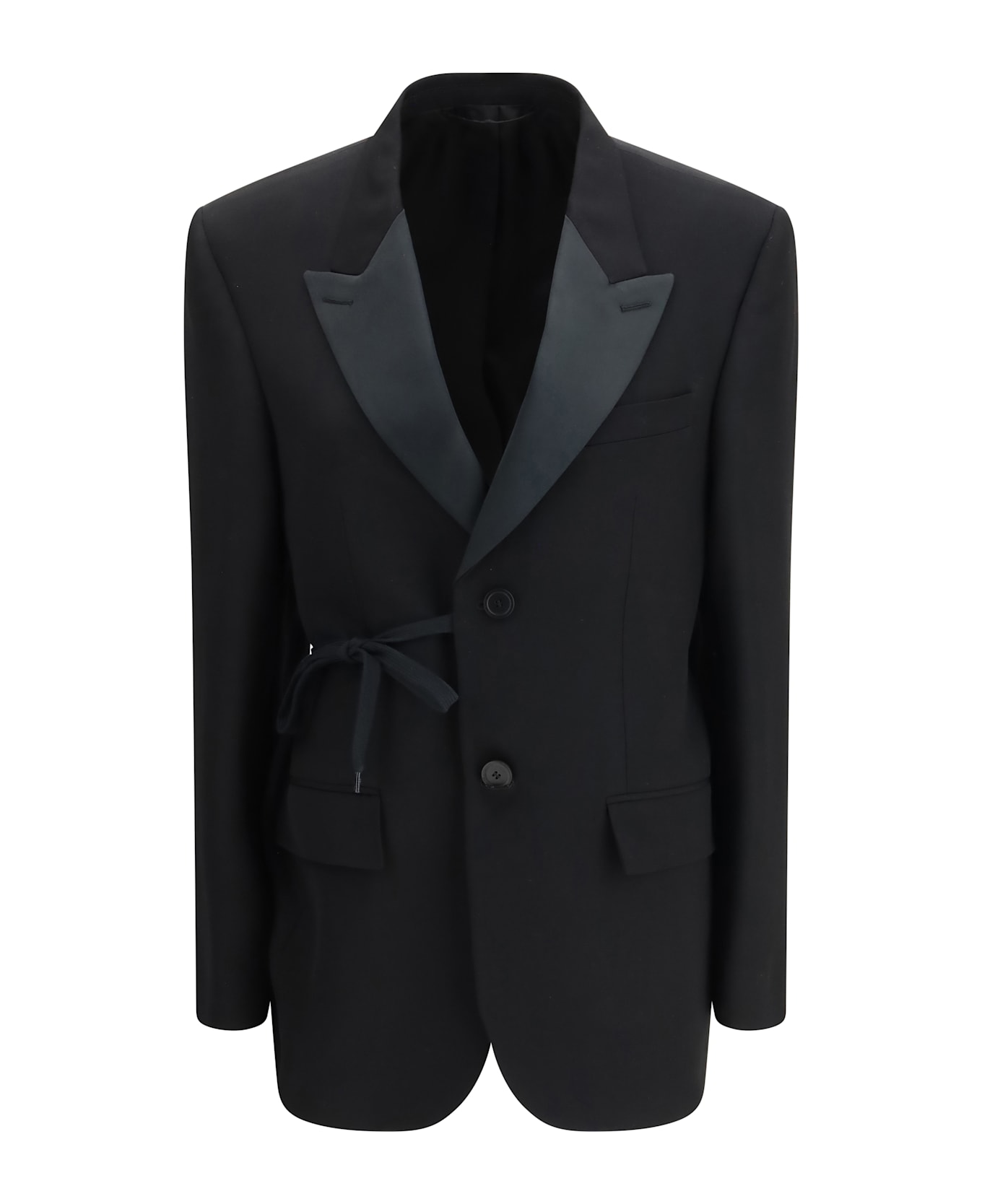 The wrap tailored jacket by balenciaga offers a refined reinterpretation of classic tailoring with a modern, sophisticated edge. crafted from wool, it features a wrap construction with single-breasted front closure and a self-tie drawstring at the waist, subtly shaping the silhouette. the design is completed with classic lapels, a welt chest pocket and two front flap pockets. long sleeves with buttoned cuffs, a central back vent and a cupro lining ensure comfort and ease of movement. finished with a regular fit, this jacket embodies balenciaga s contemporary tailoring aesthetic.