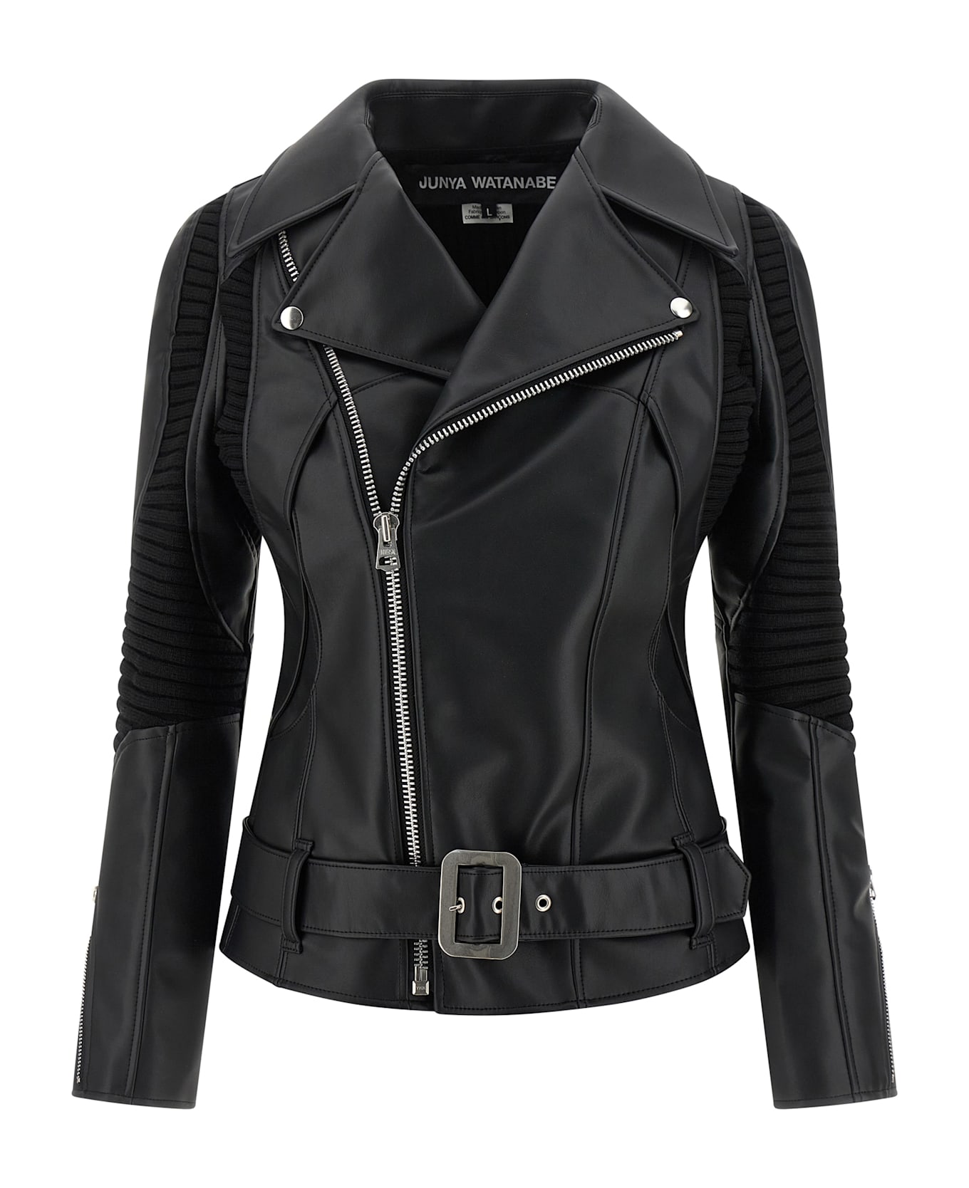 Leather-effect jacket with cut-out details and stretch ribbed knit inserts, front asymmetric zip closure, pockets, long sleeves with zip on the cuffs, and removable belt.