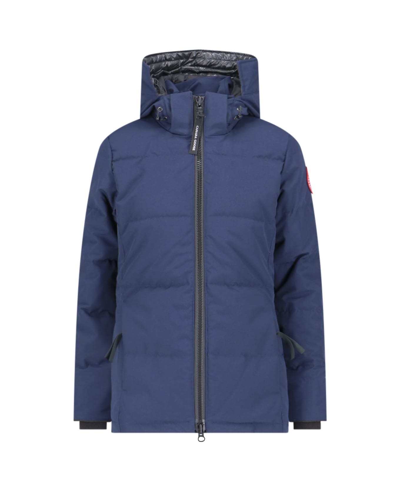 Canada Goose padded down jacket in blue nylon with hood, zip closure, drawstring, logo patch sleeve, two front zip pockets, ribbed knit cuffs, inner shoulder straps, and straight hem. Composition: 100% Polyamide