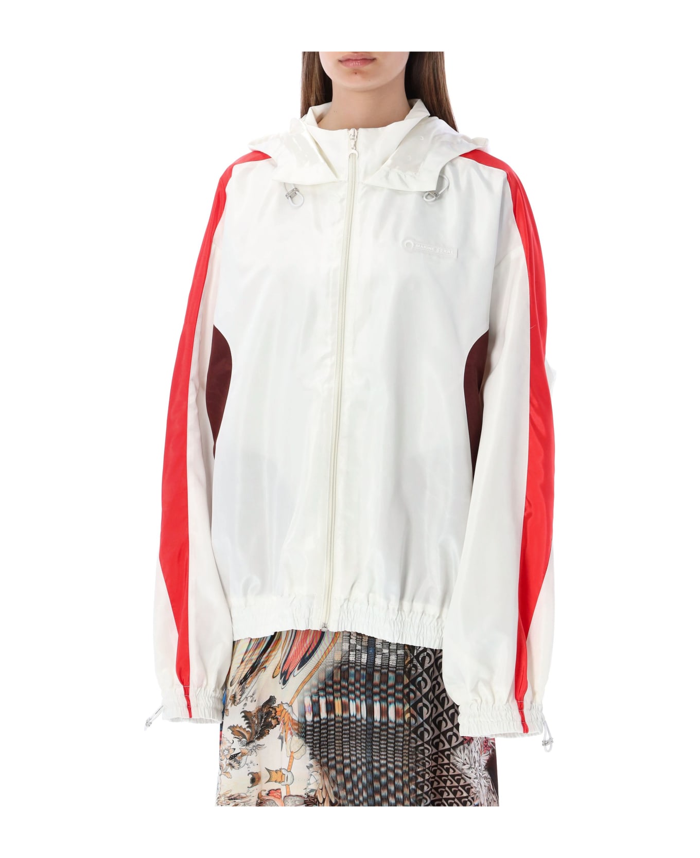 White Panneled Moire Track Jacket By Marine Serre. Featuring: - Stand-up Collar - Zip Closure - Drawstring Hood - Logo Patch At Chest - Contrast Panels Inserts - Long Sleeves - Logo Print At Back - Side Slit Pockets - Elasticated Hem And Cuffs