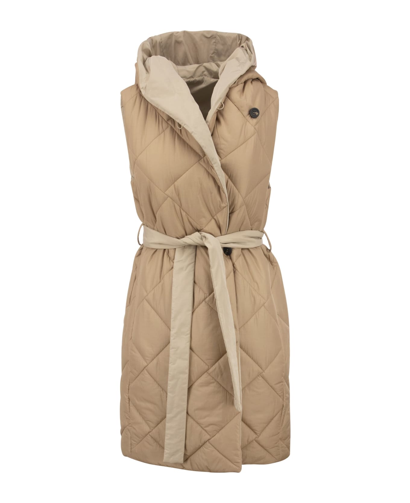 The reversible padded gilet by Peserico is a long model that will make your winter wardrobe elegant. Padded, it is a diamond-quilted model with a hood and button fastening and a belt that cinches the waist. - Side pockets - Regular fit DESIGNER ID: S03305A A6960 A45 Composition: Fabric + 2 Fabric + Padding 100% Polyester