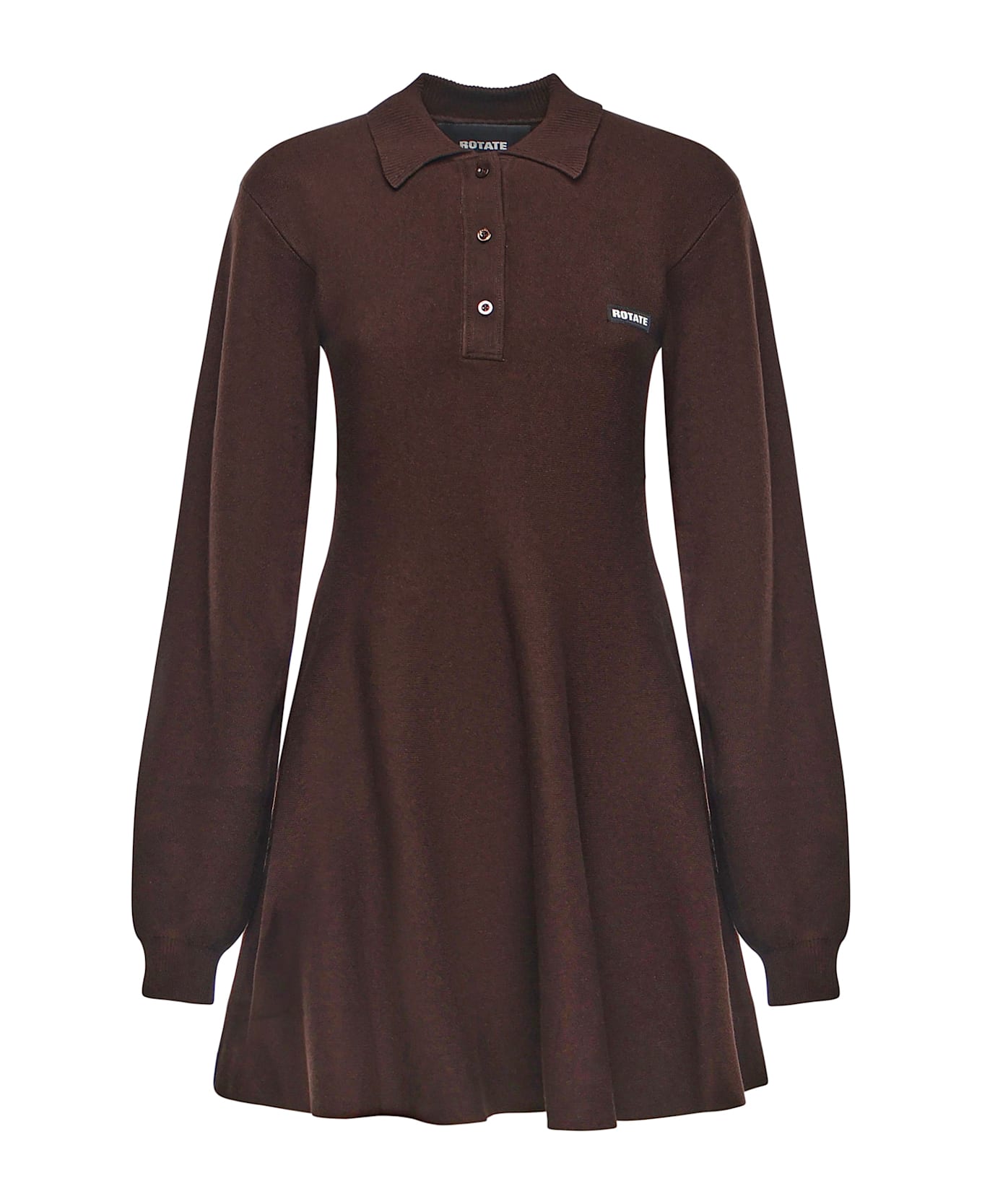 - Made of Slinky knit - Polo collar - Lettering logo - Long sleeves - Flared skirt - Size shown in photo is XS - Color: Brown