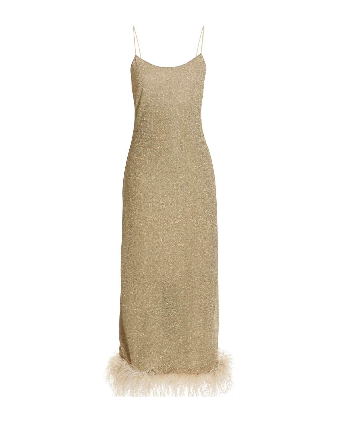Lumiere Plumage' long dress in lurex lined, thin straps and feather appliqués on the bottom hem.