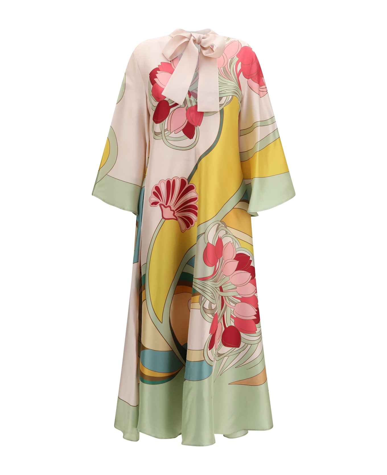 The magnifico dress by la doublej reflects the brand s vibrant elegance through a fluid and sophisticated silhouette. crafted from luxurious silk twill, the design is enhanced by the tulip placée positioned print, adding a distinctive and refined character to the piece. the dress features a mandarin collar and a back neck tie detail that introduces a unique touch to the construction. cascade sleeves add movement and lightness to the silhouette, completing a feminine and statement-making design.