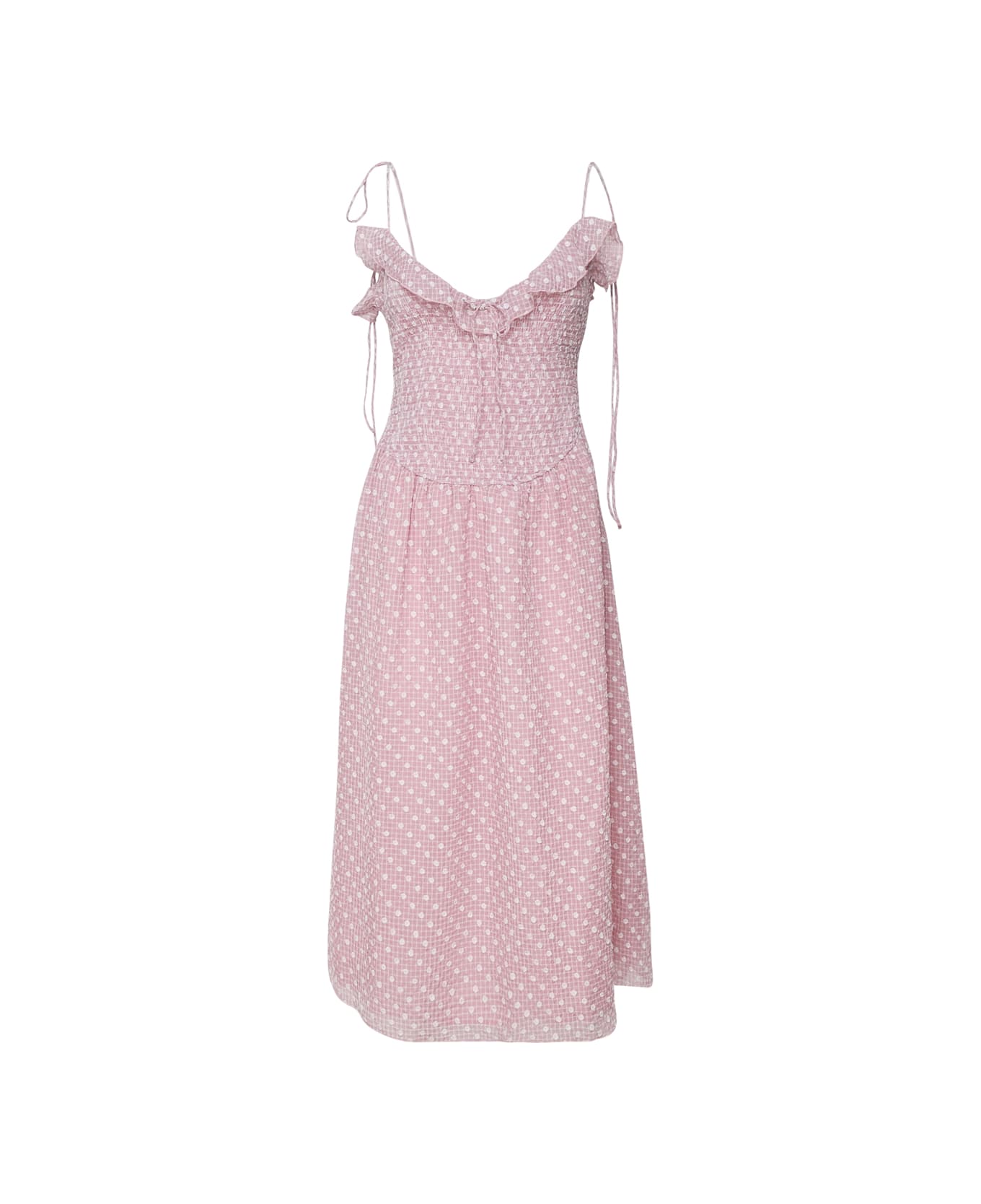 -Full skirt length lining -Ruffled neckline -Adjustable skinny tie shoulder straps -Decorative center-front bow -Contoured waist -Colour: Pink retro