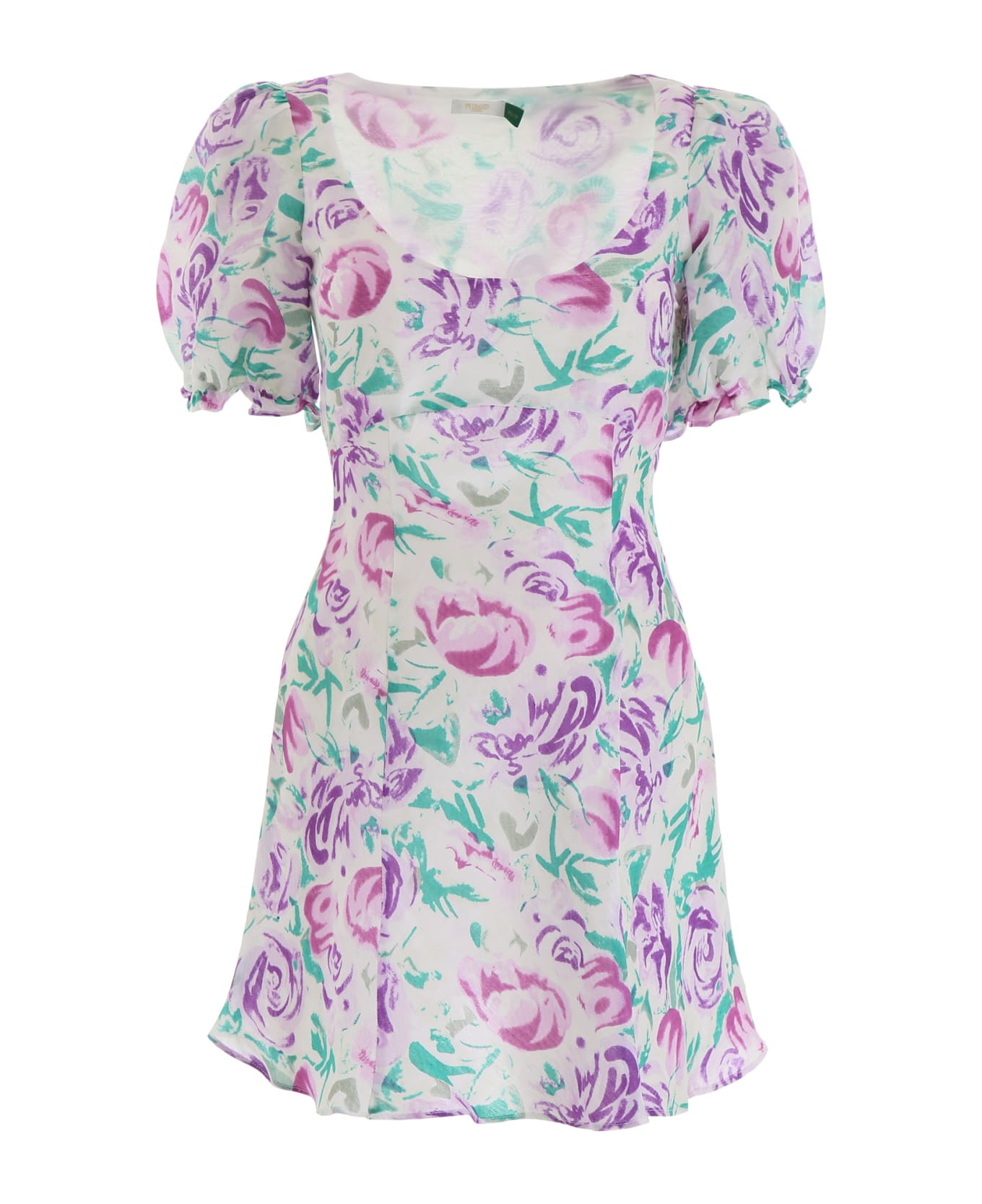 Rixo linen and silk blend mini dress with all-over floral pattern. It features short puff sleeves and side concealed zip closure. Model height is 177 cm and she is wearing a size UK 8.