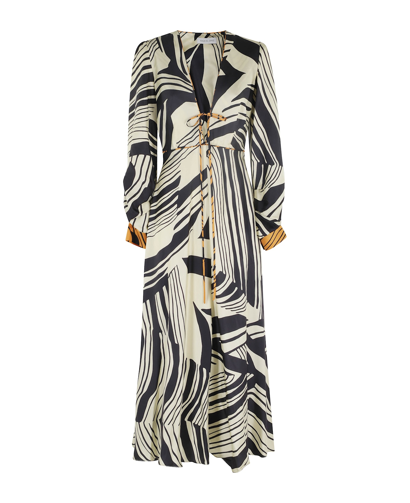 Category: Dress Item: Valerie Dress Brand: Raquel Diniz Color: Ivory Neckline: V-neck with drawstring Details: Silk printed fabric, side zipper closure SIZE AND FIT Fit: Soft Sleeve: Long with drape and cuff Line: Flared