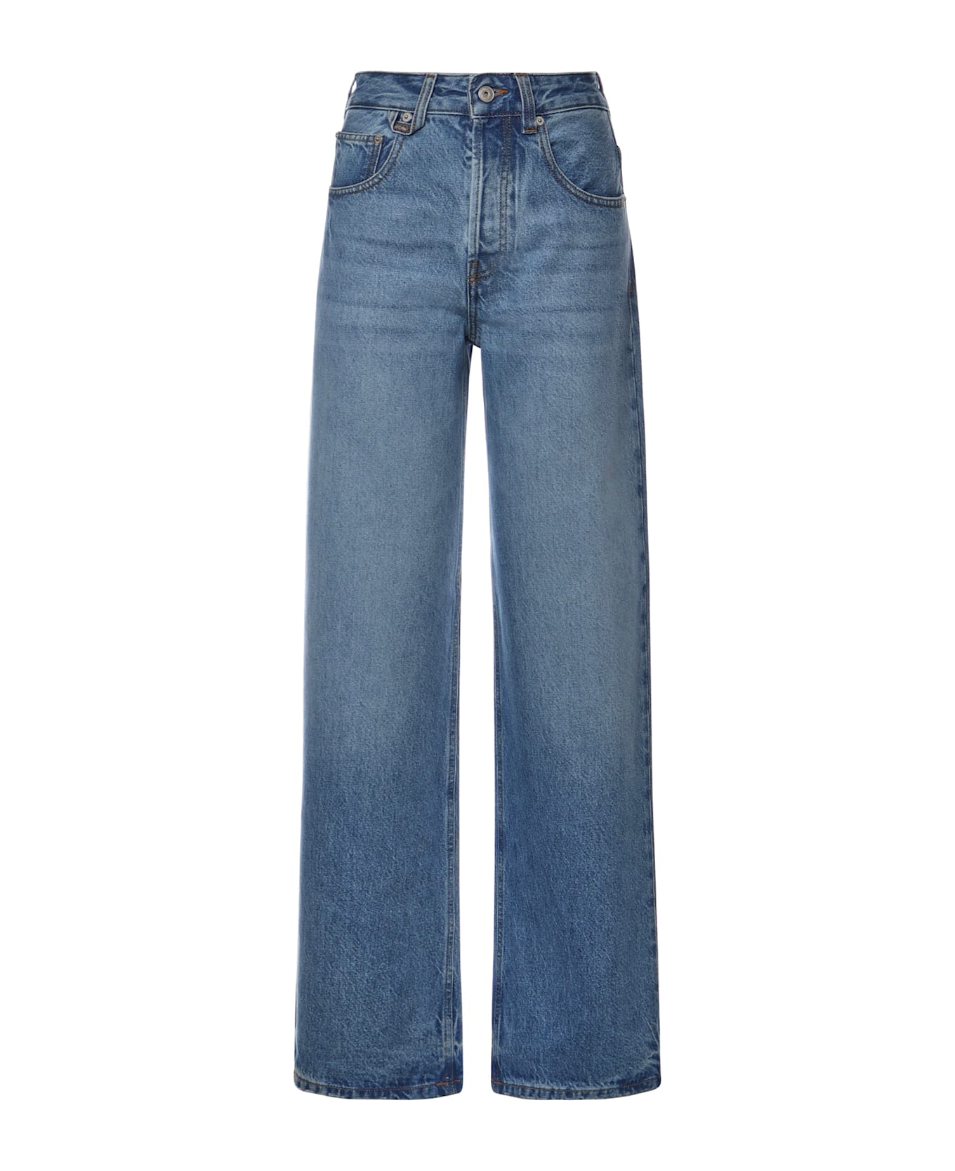- Made of cotton denim - Button closure - Belt loops - Wide leg - Size shown is 23 - Made in Italy - Designer color: Blue, Tobacco