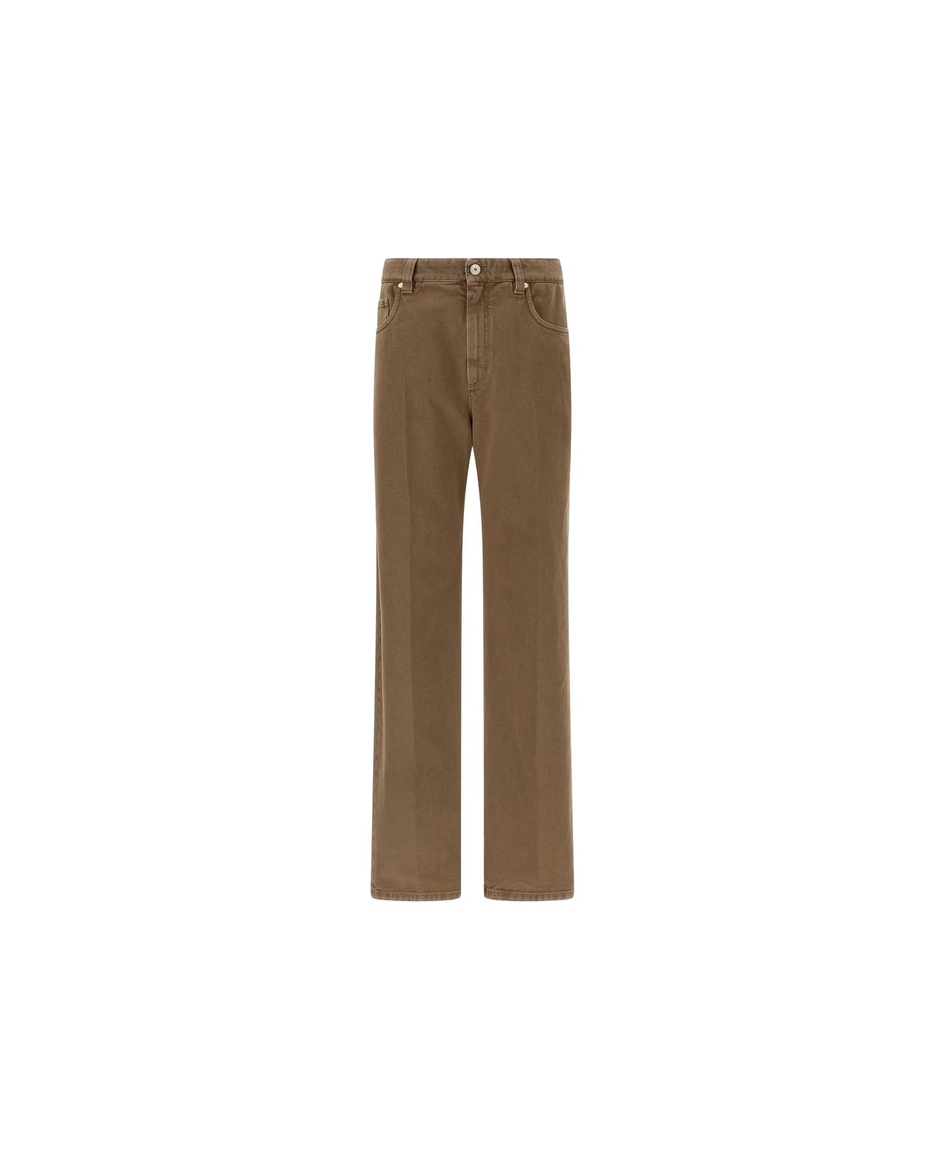 brown five pockets zip and button closure belt loops straight leg front pleat