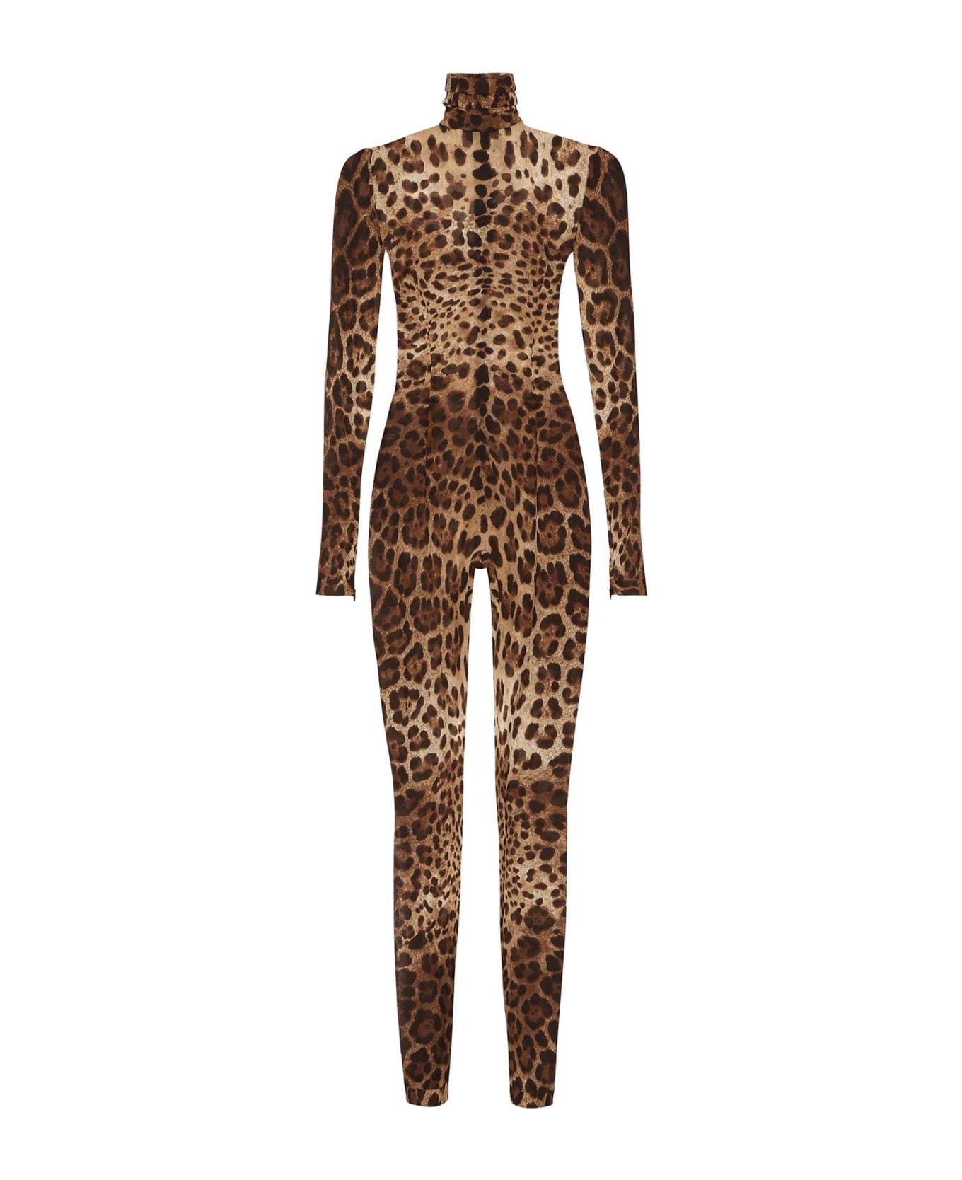 Dolce & Gabbana long-sleeved turtleneck jumpsuit made of semi-sheer leopard-printed silk chiffon. Shaped to a fitted silhouette, it closes with invisible zippers at the back, cuffs and ankles. Re-Edition label stitched on the cuff. The model is 177 cm tall and wears a size IT 40. Composition: 91%SE, 9%EA