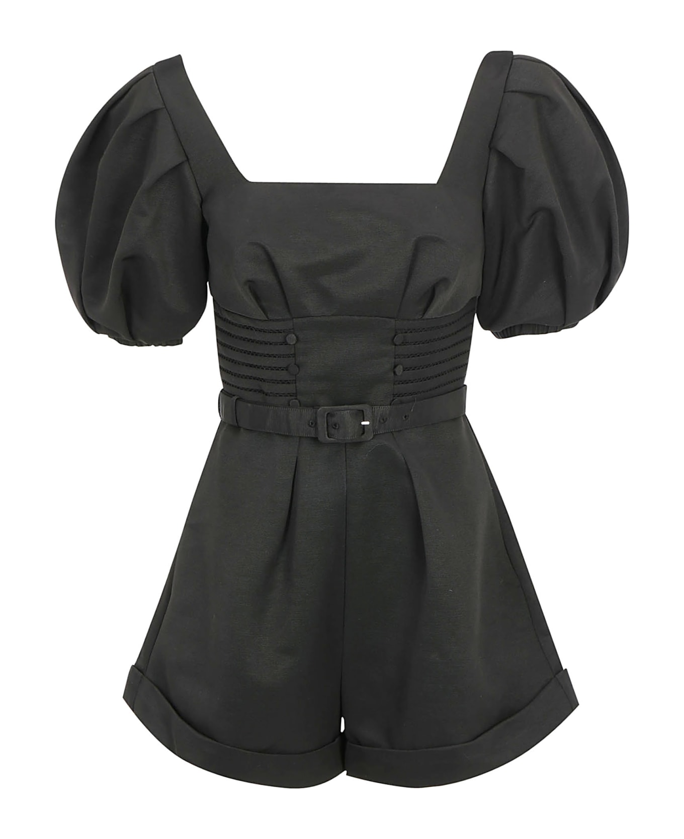 Black Playsuit by Self-Portrait, puffy short, square neck line, mini buttons on front, removable and adjustable belt, zip closure on back. Composition: 100% Polyester