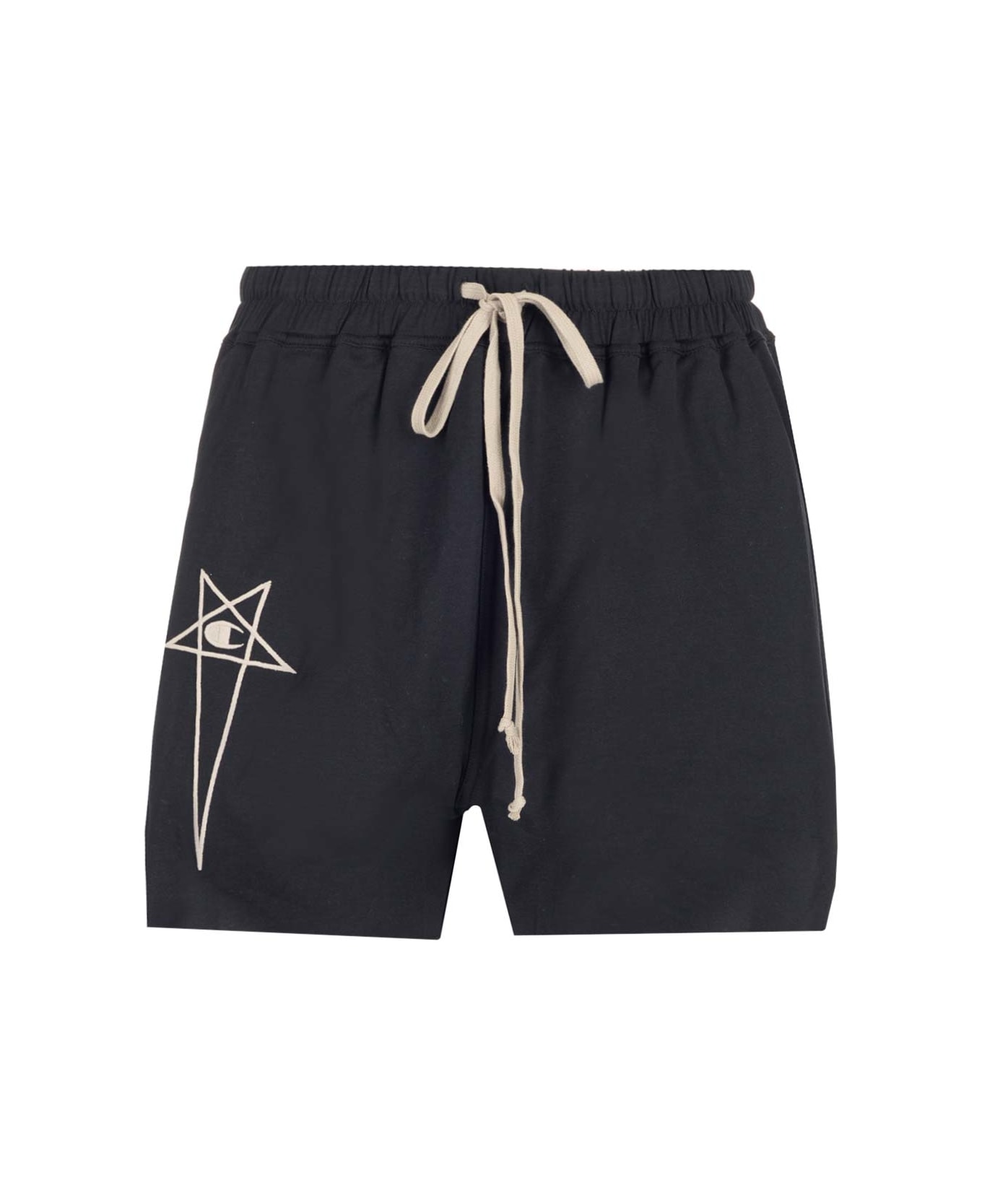 Black cotton jersey "Dolphin" flared shorts by Rick Owens X Champion featuring side pockets, vents, an elasticated drawstring waist and a 3D pentagram logo on the side.