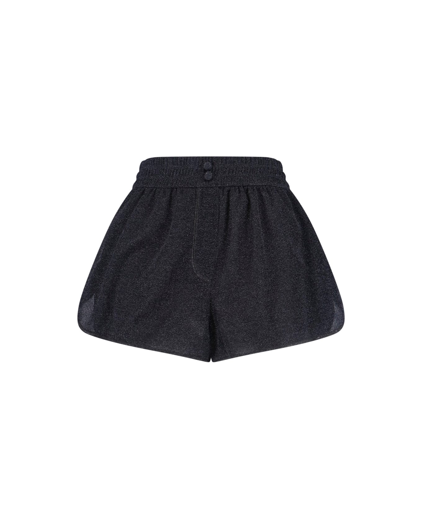 Oseree 'lumière' shorts in black metallic semi-transparent fabric with medium elastic waistband, front buttons, straight leg.