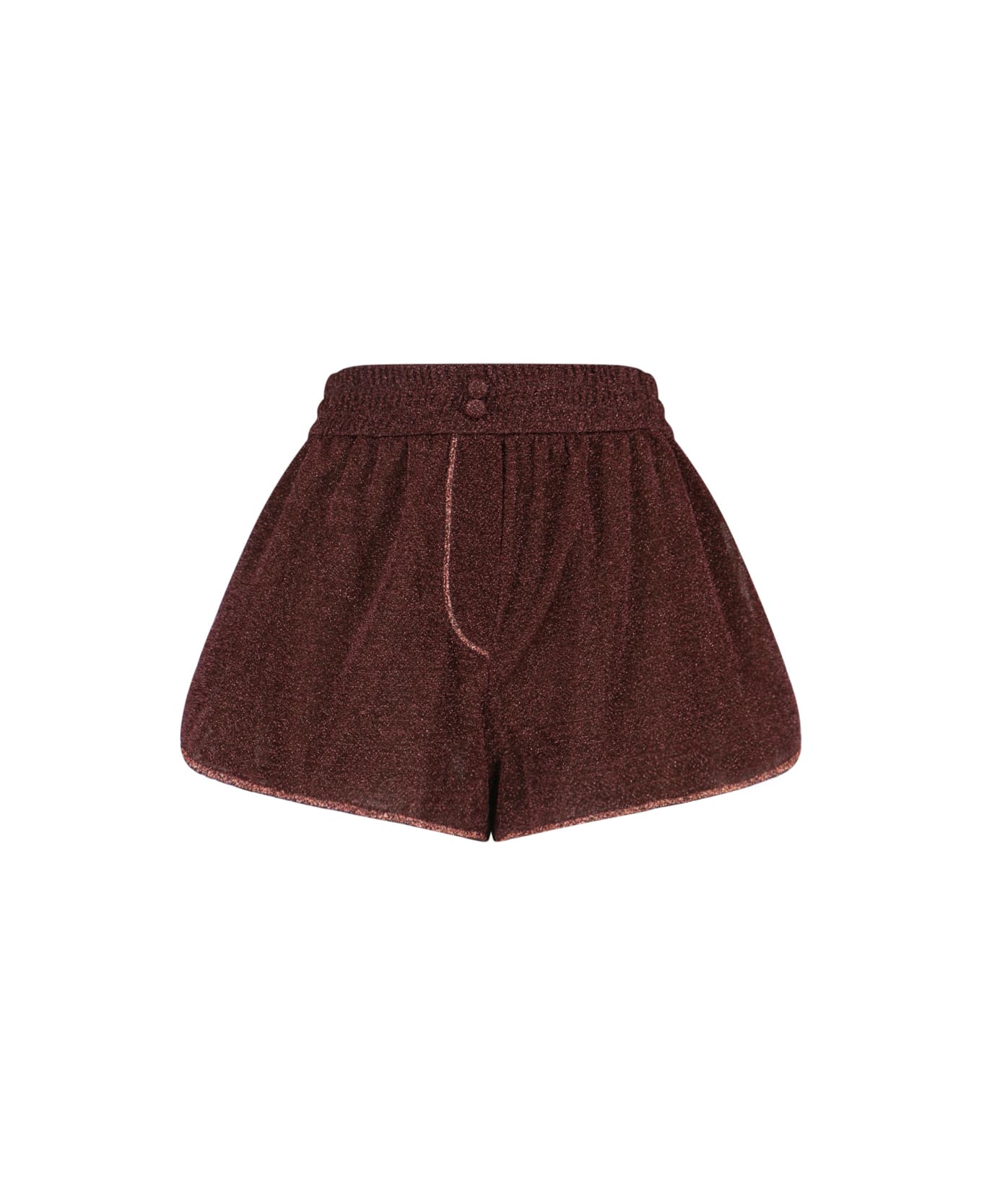 Oseree 'lumière' shorts in brown metallic semi-transparent fabric with elastic waistband, front buttons, straight leg.