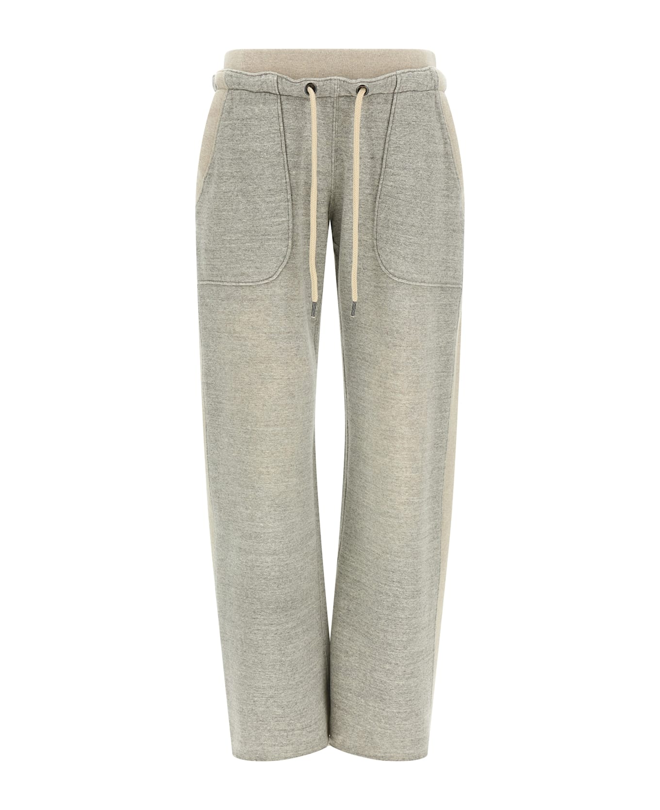 Mélange fleece cotton joggers with stretch knit inserts and side ribbed, drawstring elastic waistband, wide leg, pockets, leg bottoms with raw cut hem. Composition: 100% cotton