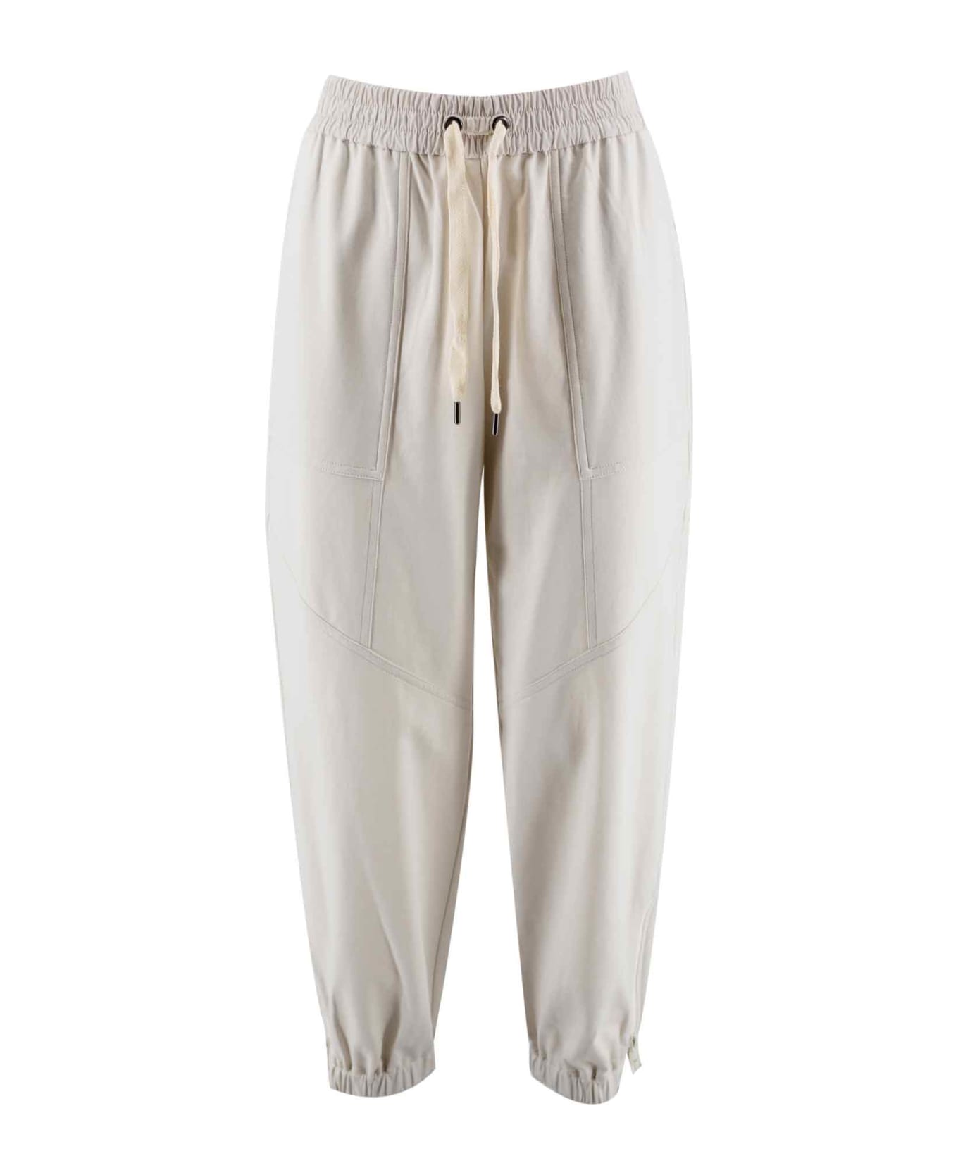 White, elasticated drawstring waist, two side welt pockets, two shaped back pockets and elasticated cuffs. Composition: Cotone, 98% , Spandex/elastam, 2%