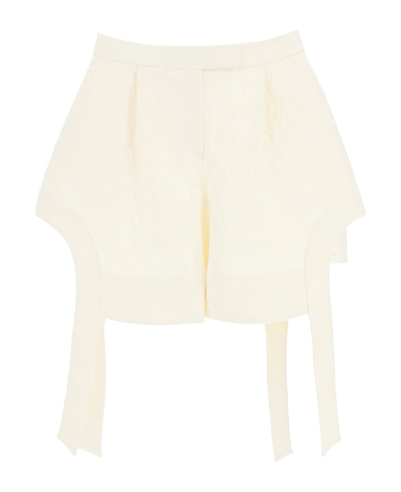 Simone Rocha sculpted shorts crafted in cotton-blend floral brocade with side cut-outs enriched with hanging strips. Front pleats, side inseam pockets, rear welt pocket and front concealed closure with zip, hook and button. The model is 177 cm tall and wears a size UK 6.