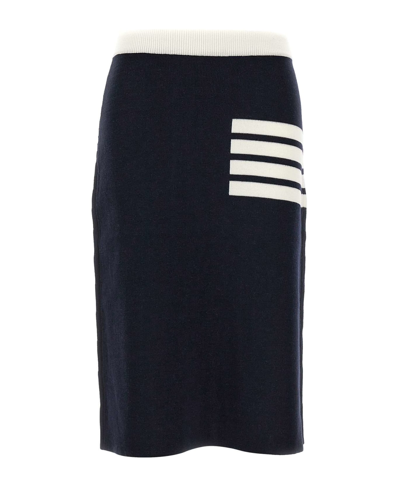 Thom Browne merino wool "Double Face A Line Skirt", navy blue, high elasticated waist, sheath line that follows silhouette, iconic four lines, gros-grain tab on back, slim fit with adherence at waist and on sides, wide on leg ( on height 1. 78 the size worn is 40). Made in Italy.