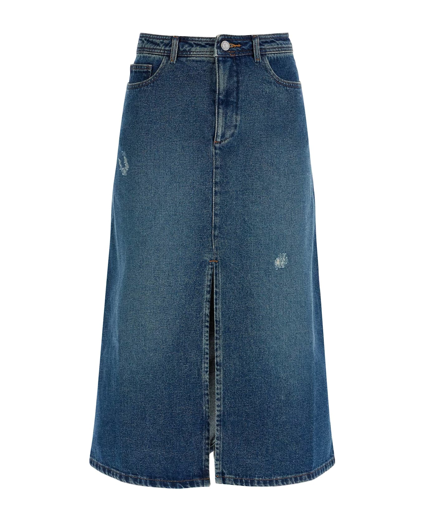 This A. P. C. midi skirt in faded denim features distressed details for a worn-in look. It has a slightly flared cut with a mid-rise waist and a front slit. The five-pocket design is completed by belt loops and a hidden zip and button closure. The model is 177 cm tall and wears a size FR 34.