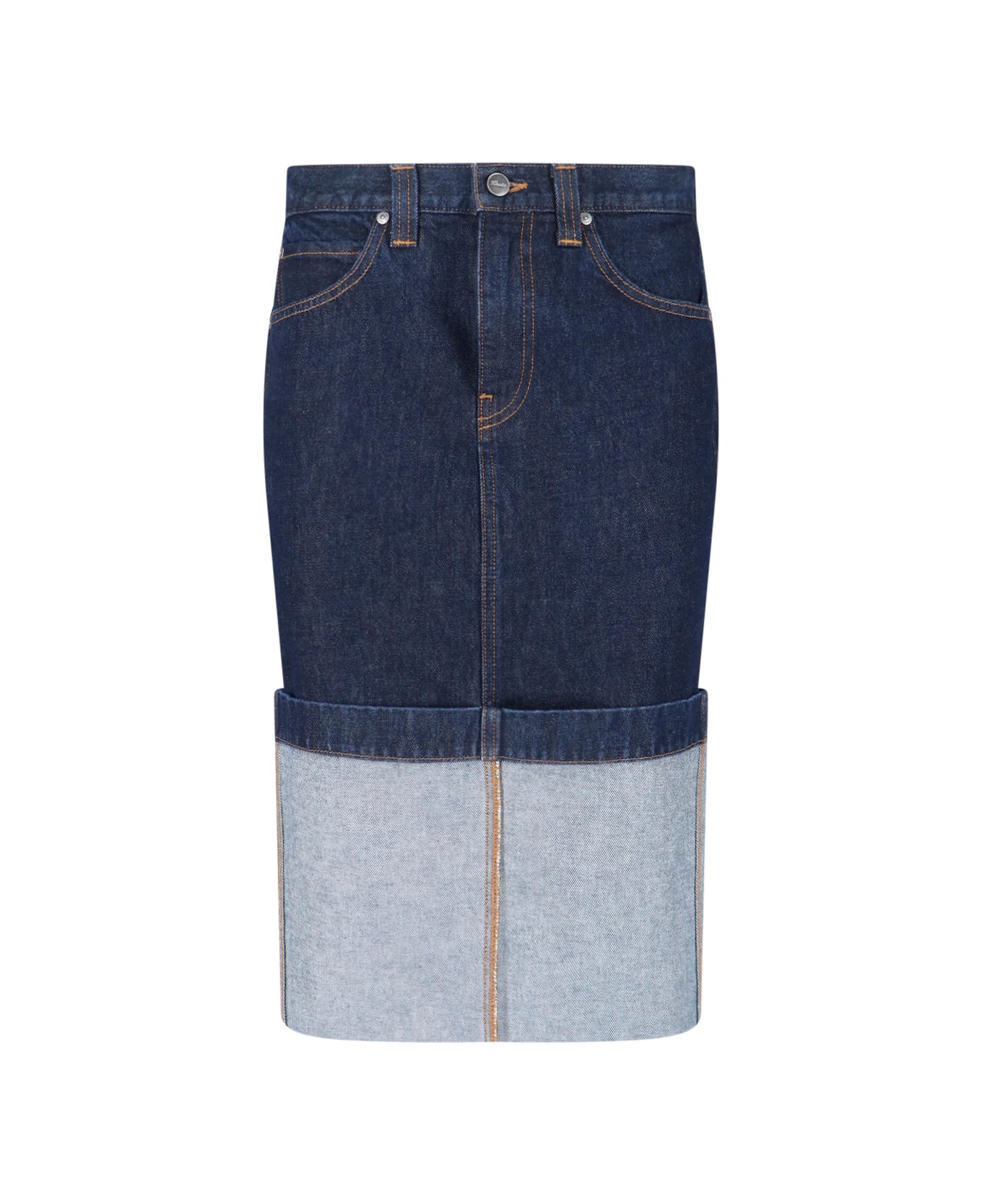Midi skirt "Kilian" by Khaite in blue cotton denim, mid-rise, zip and button closure, five-pocket design, logo patch at the back, back slit, maxi hem. Composition: 100% Cotton