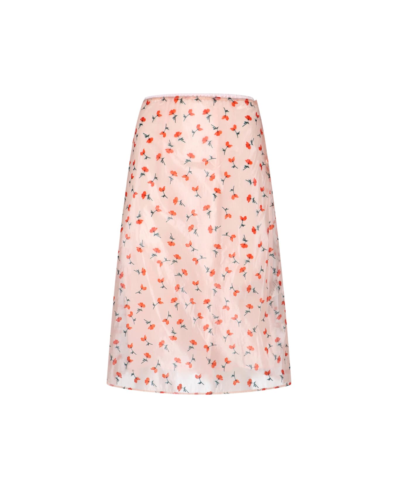 Jil Sander midi skirt in pink fabric, medium waist, all-over floral pattern. Composition: 100% Polyamide