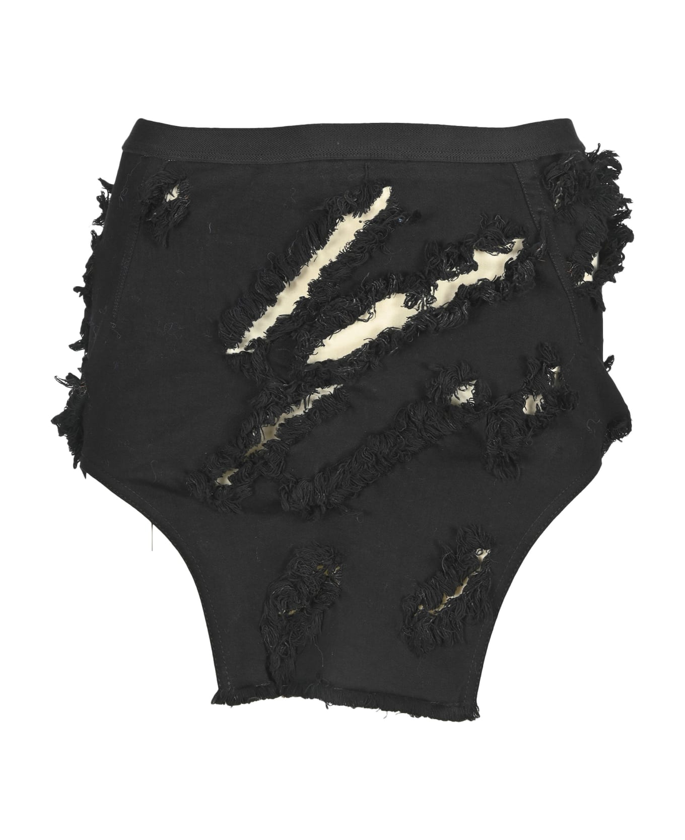 Black Cotton Blend Diana Mini Skirt By Rick Owens. Featuring: - Elasticated Waistband - Ripped Details All-over - Open Sacri Splits On Each Side