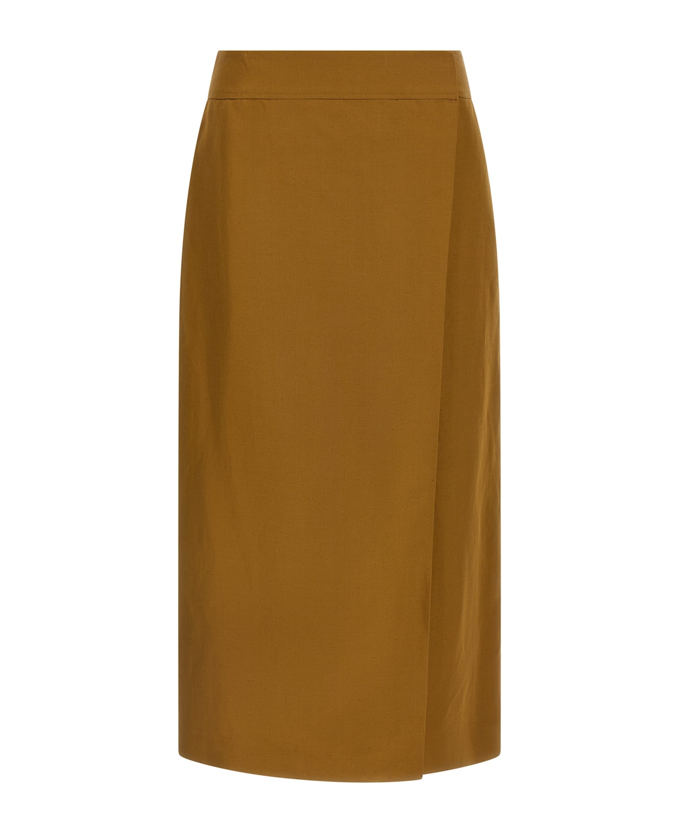 Midi skirt in viscose and linen blend, wallet style with asymmetric closure and front hook.