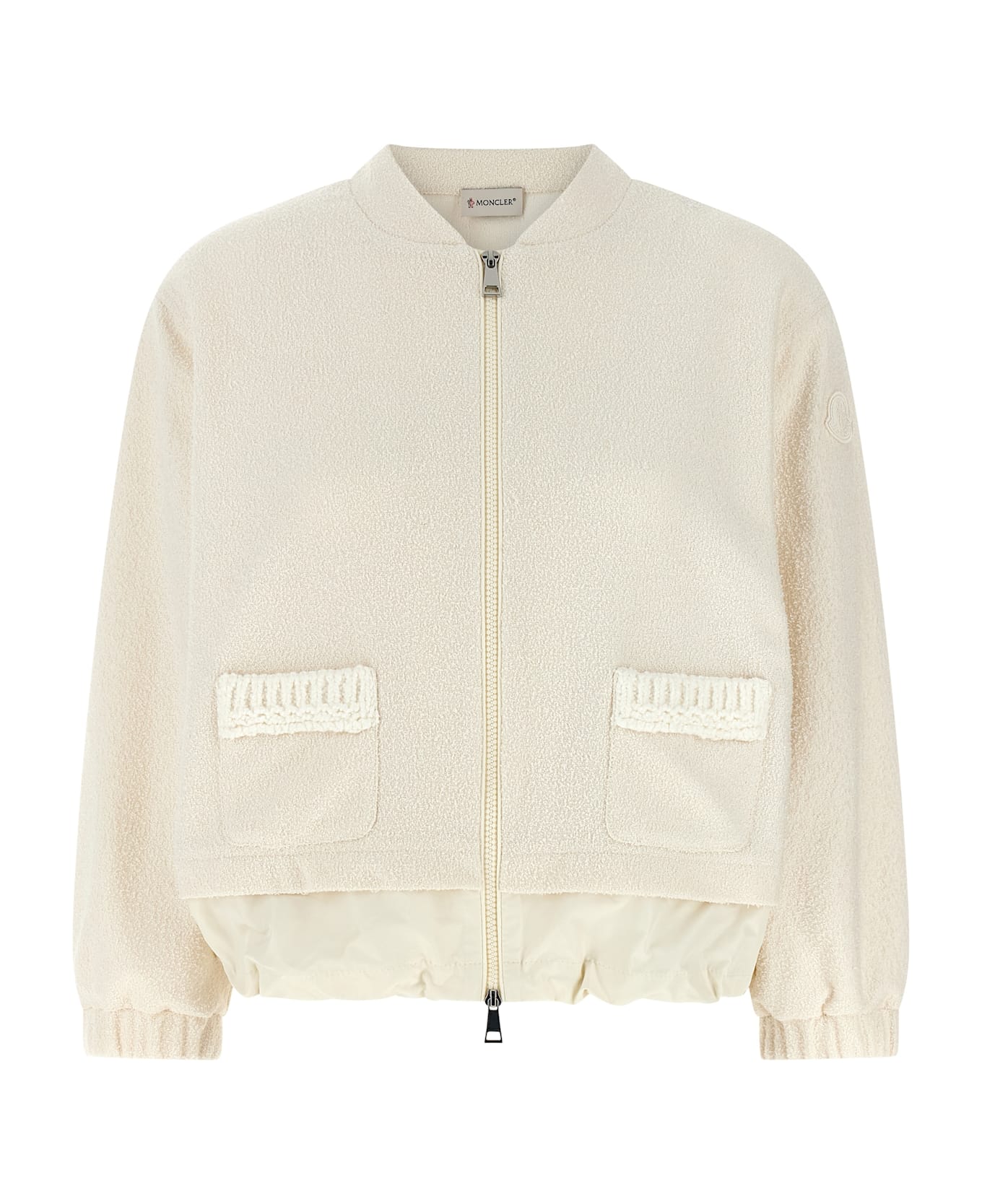 Cardigan in light bouclé fabric with flared silhouette, high neck, front zip closure, pockets with tone-on-tone knitted wool piping, long sleeves with elastic cuffs and felt logo patch appliqué, tone-on-tone nylon insert with drawstring on the hem.