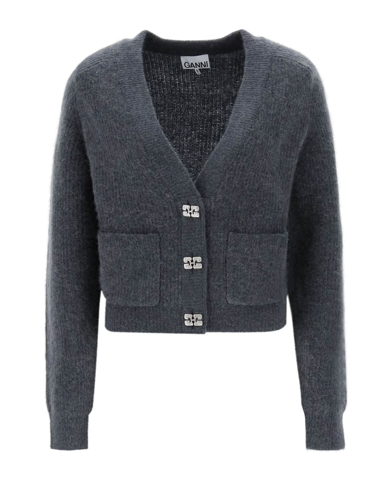 Ganni cardigan crafted in alpaca and merino wool. Characterized by V-neck with Ganni Butterfly jewel button closure, this garment features front patch pockets and ribbed trims. Relaxed fit. The model is 177 cm tall and wears size S. Composition: 32% WP, 32% WE, 30% PA, 6% EA