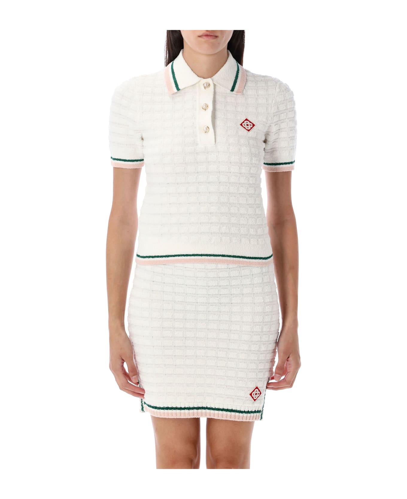 Bouclé Cotton Blend Polo Shirt By Casablanca. Featuring: Classic Polo Shirt Collar Gold Rim Pearl Buttons Placket Short Sleeves Pink, White And Green Stripe Edge Details Signature Diamond Logo Patch At Chest Slim Fit Model Is 1,70 M And Wears Size S