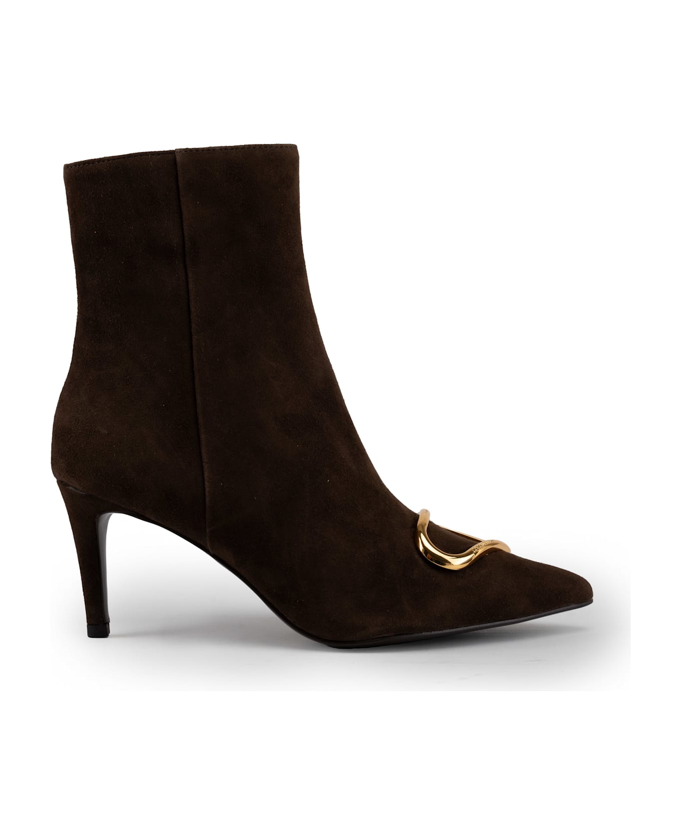 women's suede ankle boot: upper in calf suede side zip closure metal logo plectrum on the front almond shaped tip leather lining and insole leather sole heel: 7. 5 cm composition: 100% leather