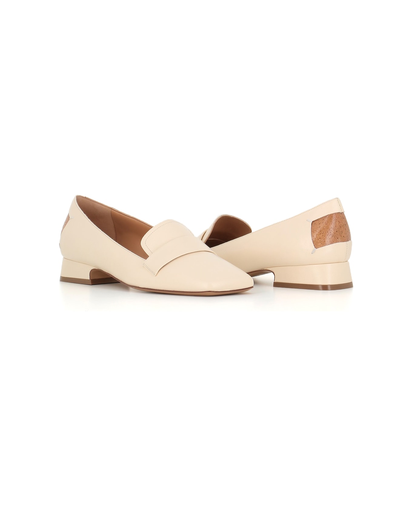 Ivory leather loafer from Maison Margiela, featuring by a square toe and from the Maison's Four Stitches décortiqué logo. Leather sole. Lined interior. Heel: 3 cm