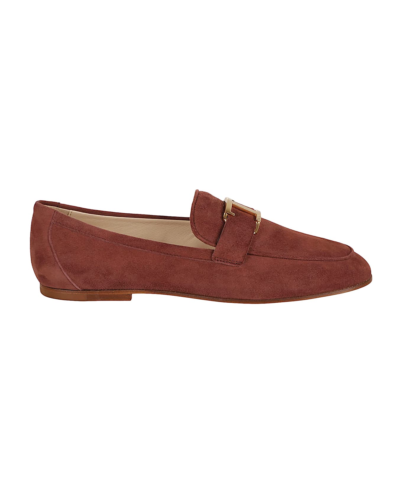 Tod's "T Timeless" loafers in brown suede, round toe, band at the top, gold-tone metal logo detail, slip-on fit, leather sole. Composition: 100% Goat Leather