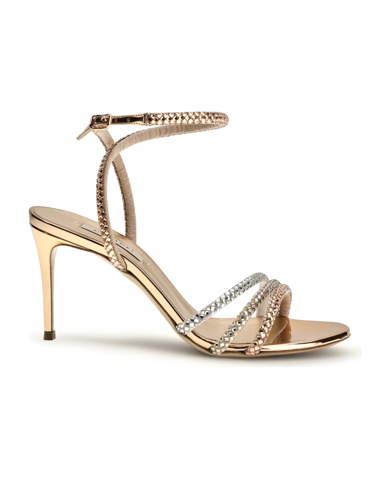 The julia andromeda sandals by casadei stand out for their tapered toe and stiletto heel, which slender the silhouette. the mirror-effect fabric on a metallic background is embellished with multicolored crystal piping that illuminates the foot, while the ankle strap ensures a stable and comfortable fit.