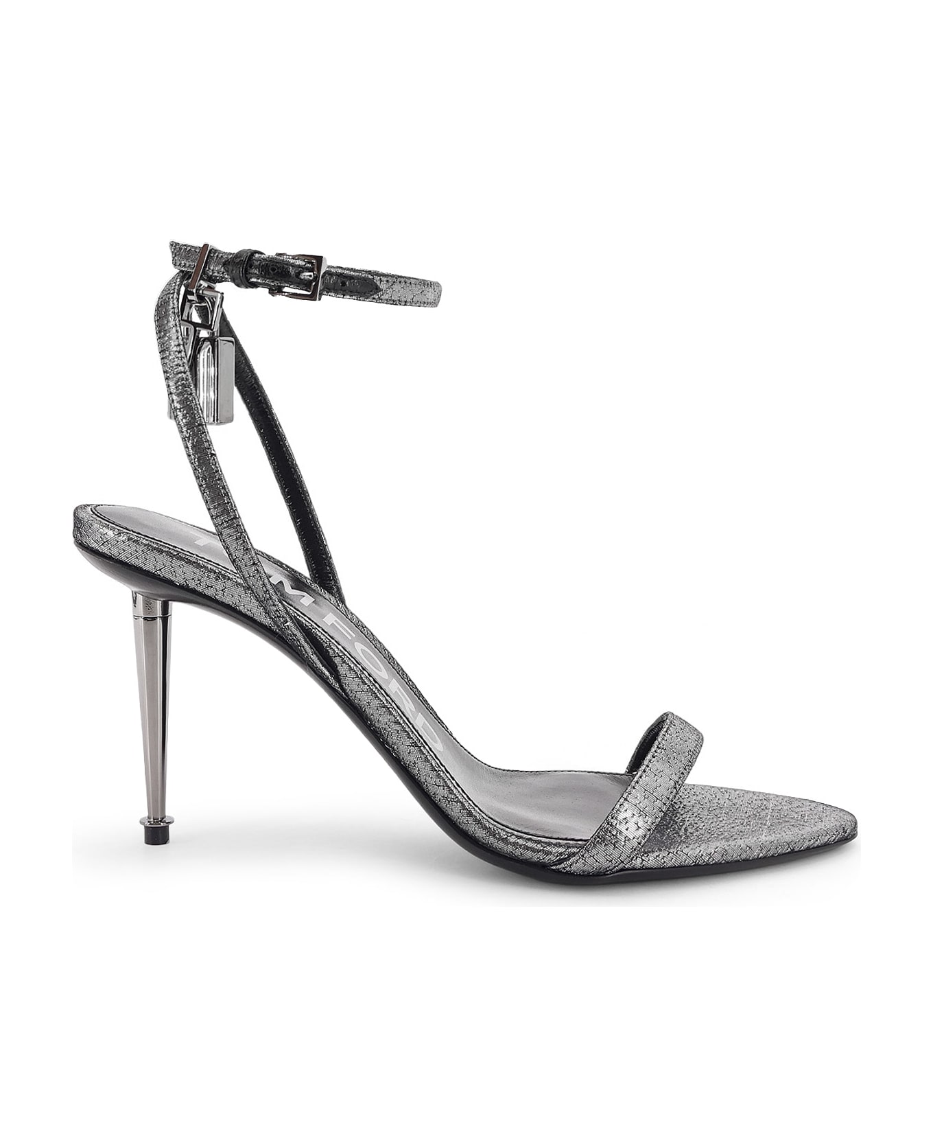 Adjustable ankle strap closure Pointed toe with metal stiletto heel Iconic metal ankle lock Made in Italy 100% polyester Sole: leather Heel height: 9 cm SKU: W2748TSY054A1G001