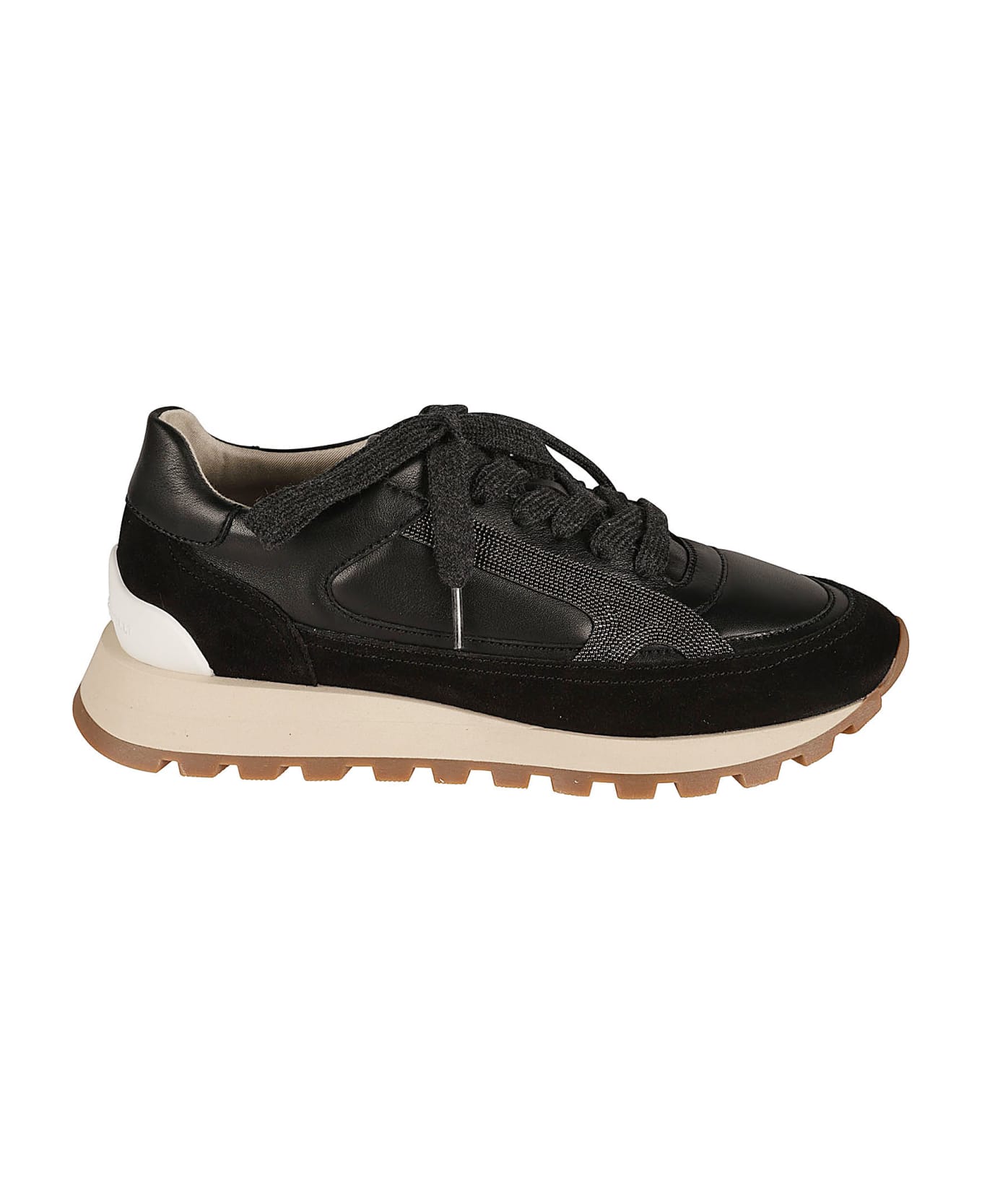 panelled low-top sneakers from BRUNELLO CUCINELLI featuring black/multicolour, calf leather, panelled design, front lace-up fastening, branded insole, ridged rubber sole and round toe.