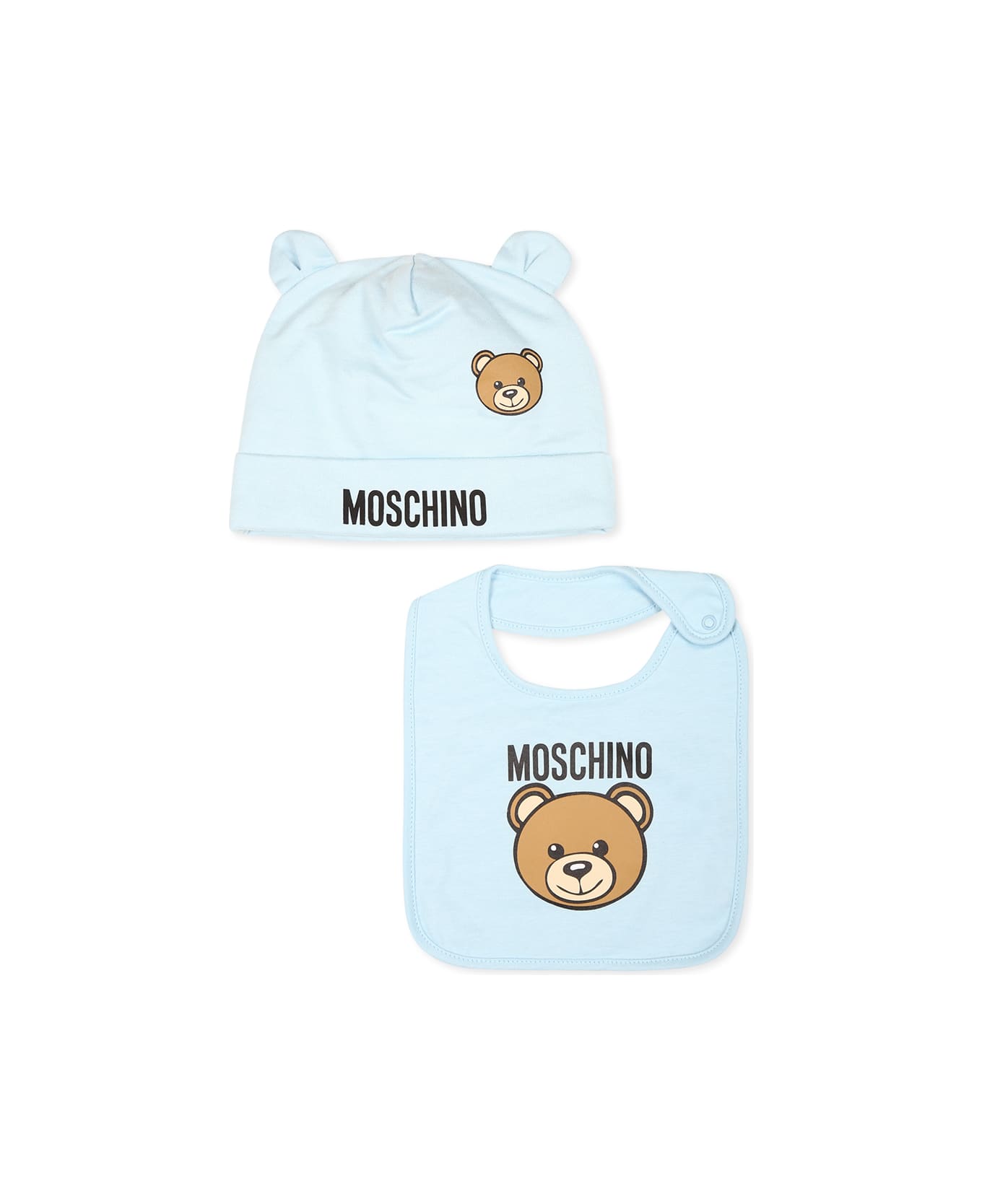 Moschino kids light blue cotton accessory set composed of a hat and bib. Hat with ears, embellished with a Teddy Bear print and black logo. Bib with a Teddy Bear print and black logo.