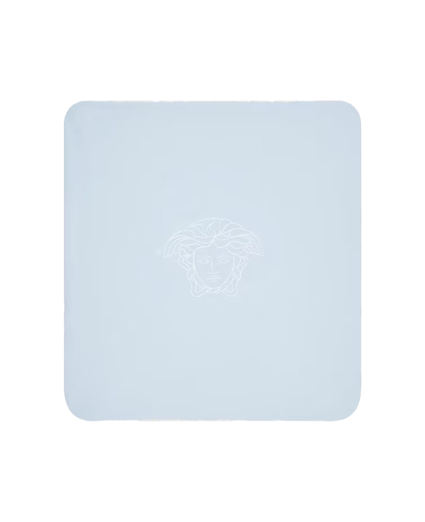 Light blue blanket from the luxury brand Versace, lightly padded and made from a cotton blend. It is embellished with Medusa embroidered on the front and baroque print on the inside.