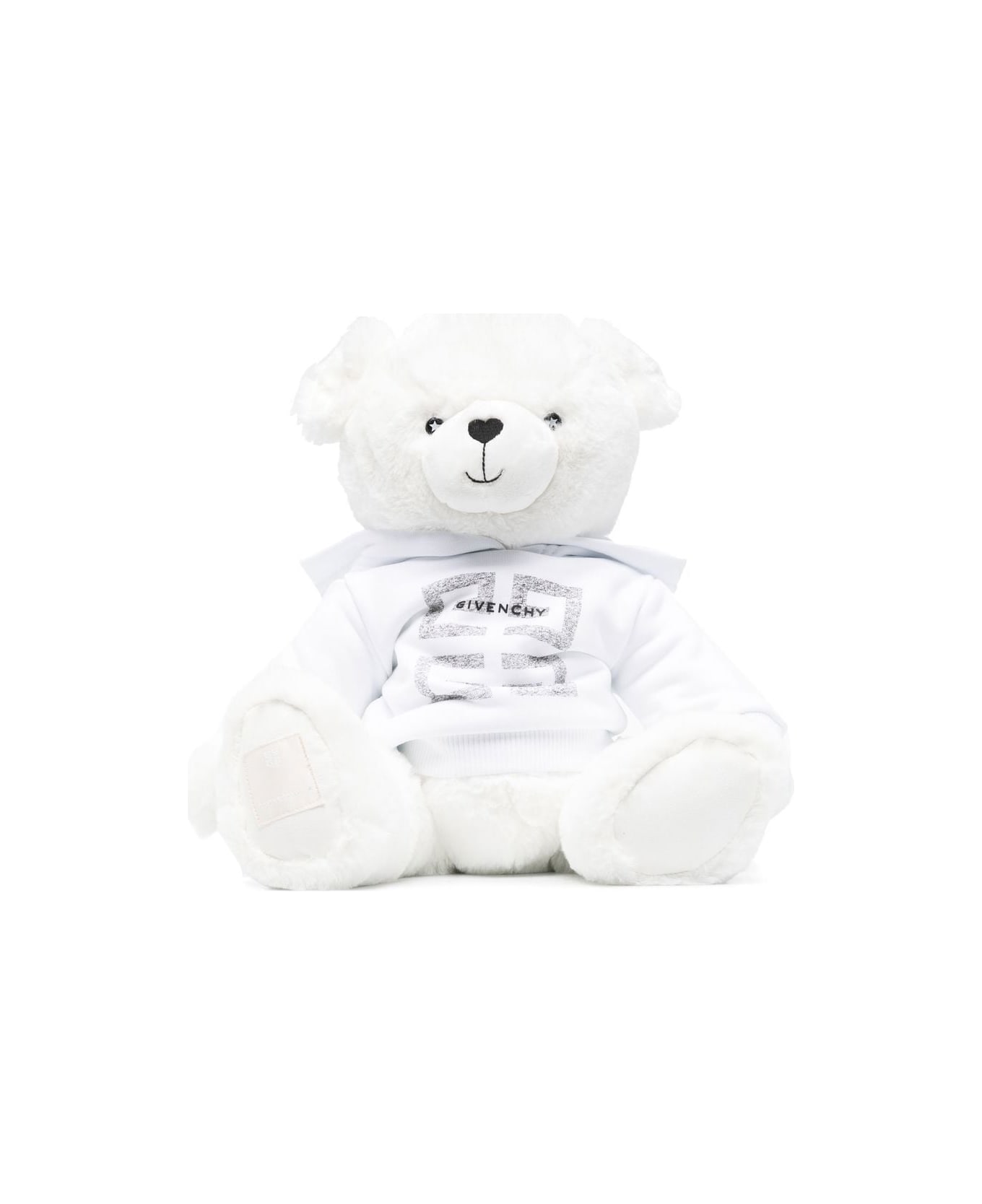 White teddy plush bear by GIVENCHY embellished with a white sweatshirt with silver 4G print. GIVENCHY Paris signature printed on the front of the sweatshirt. GIVENCHY Paris tag sewn under the right paw. Composition: 100% Polyester