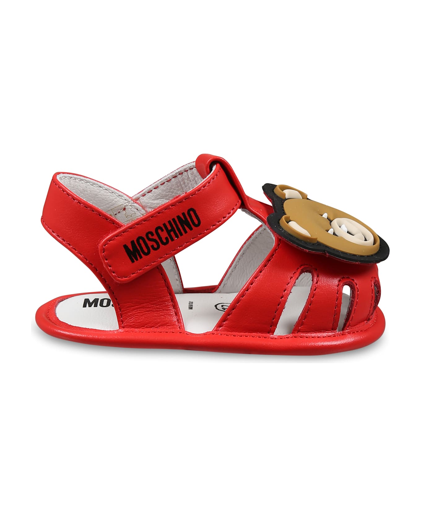 Red leather sandals, with strap and hook and loop closure. They are embellished with Teddy Bear applied on the front and side logo.