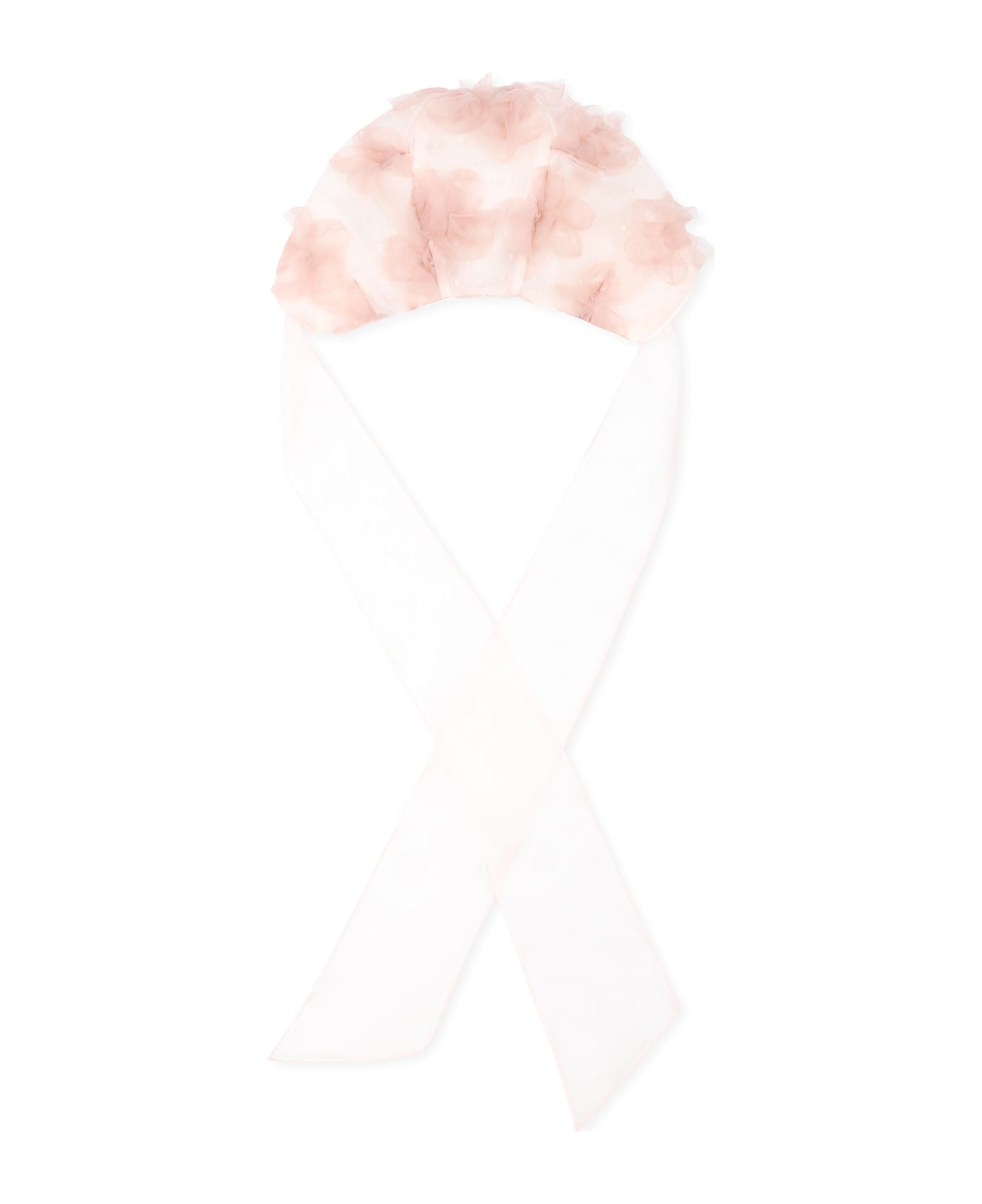 Pink hat with bow; embellished with tulle flowers and all-over polka dots.