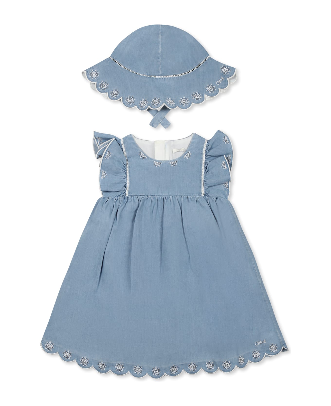 Denim dress from the French brand Chloé Kids, in organic cotton, with short sleeves with ruffles, round neckline, zip fastening on the back and scalloped hem; it is decorated with embroidered flowers on the top and bottom. Equipped with a cloche with laces, scalloped hem; embellished with embroidered flowers and logo.