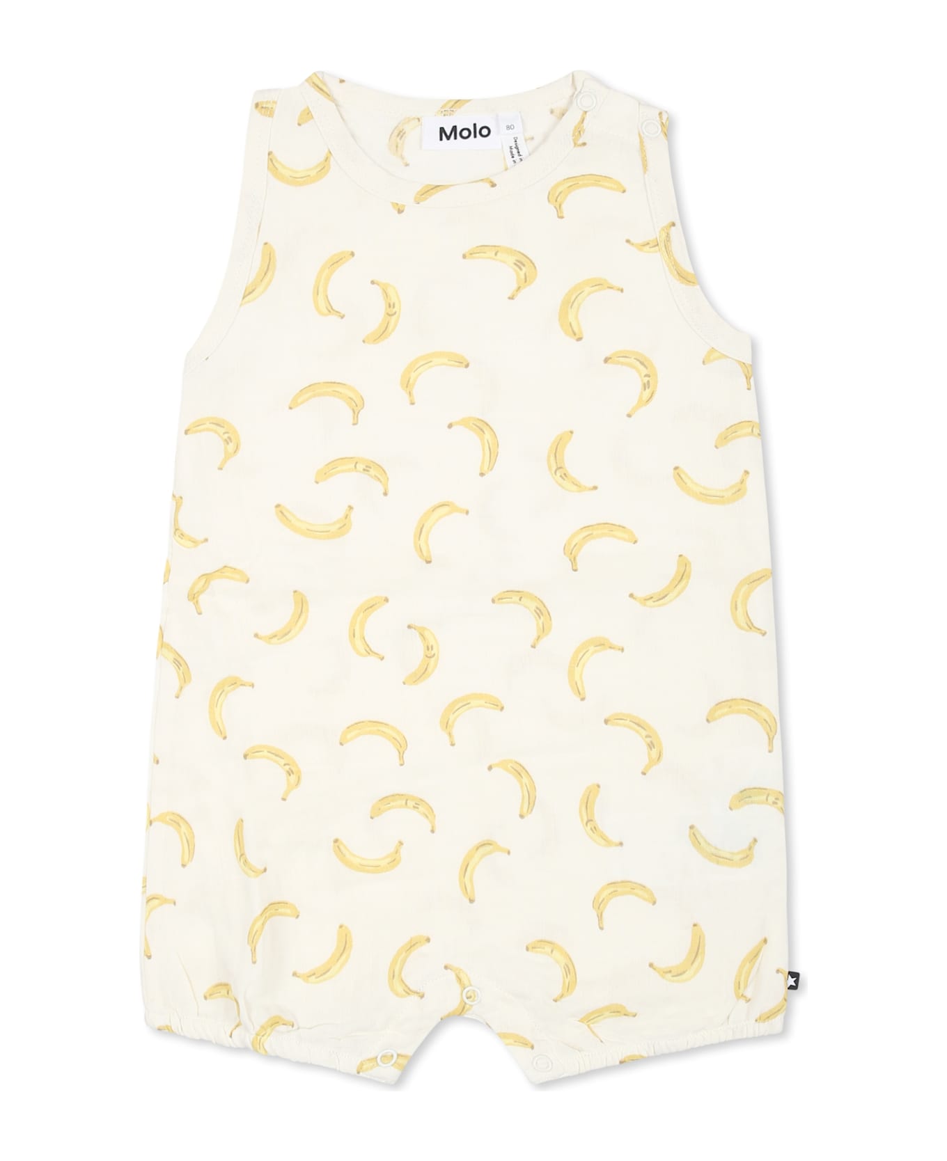 Ivory GOTS certified organic cotton romper, sleeveless, with crew neck, snap button fastening on the shoulder and between the legs. It is embellished with an all-over banana print.