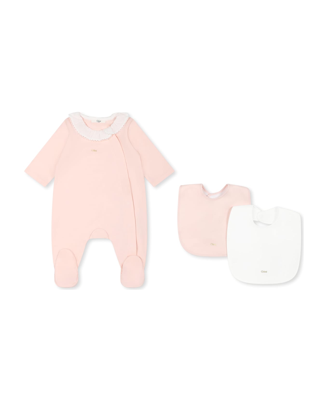 Pink babygrow set from the French brand Chloé Kids, in organic cotton, composed of a babygrow and two bibs, pink and white. Long-sleeved babygrow, with embroidered collar, snap buttons on the front and feet; snap button bibs on the back. It is embellished with a gold logo on the front.