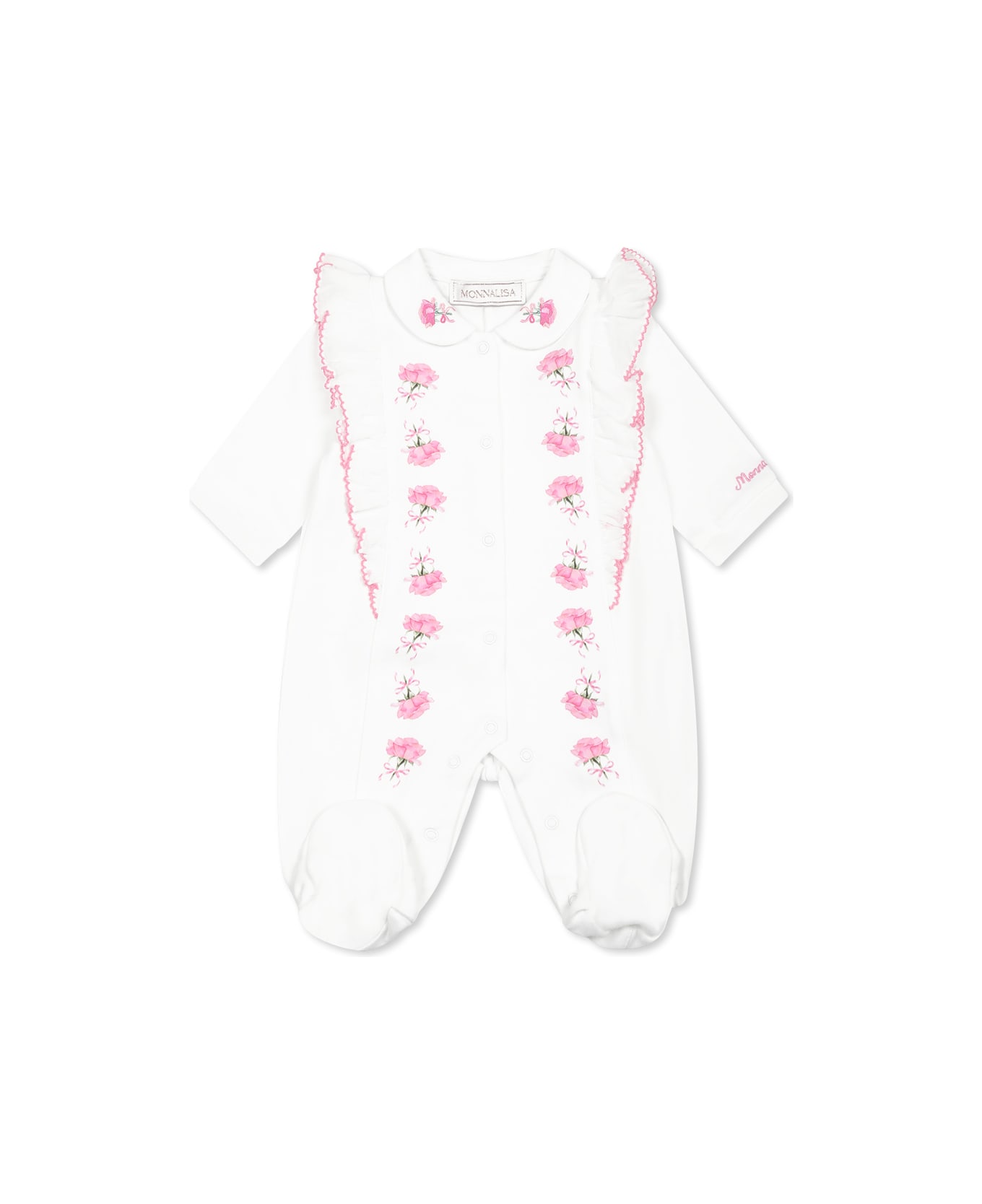 White heavy cotton babygrow, long sleeves, with peter pan collar, feet, ruffles on the shoulders, snap button fastening on the front and between the legs. It is embellished with flowers printed on the front and logo embroidered on the cuff.