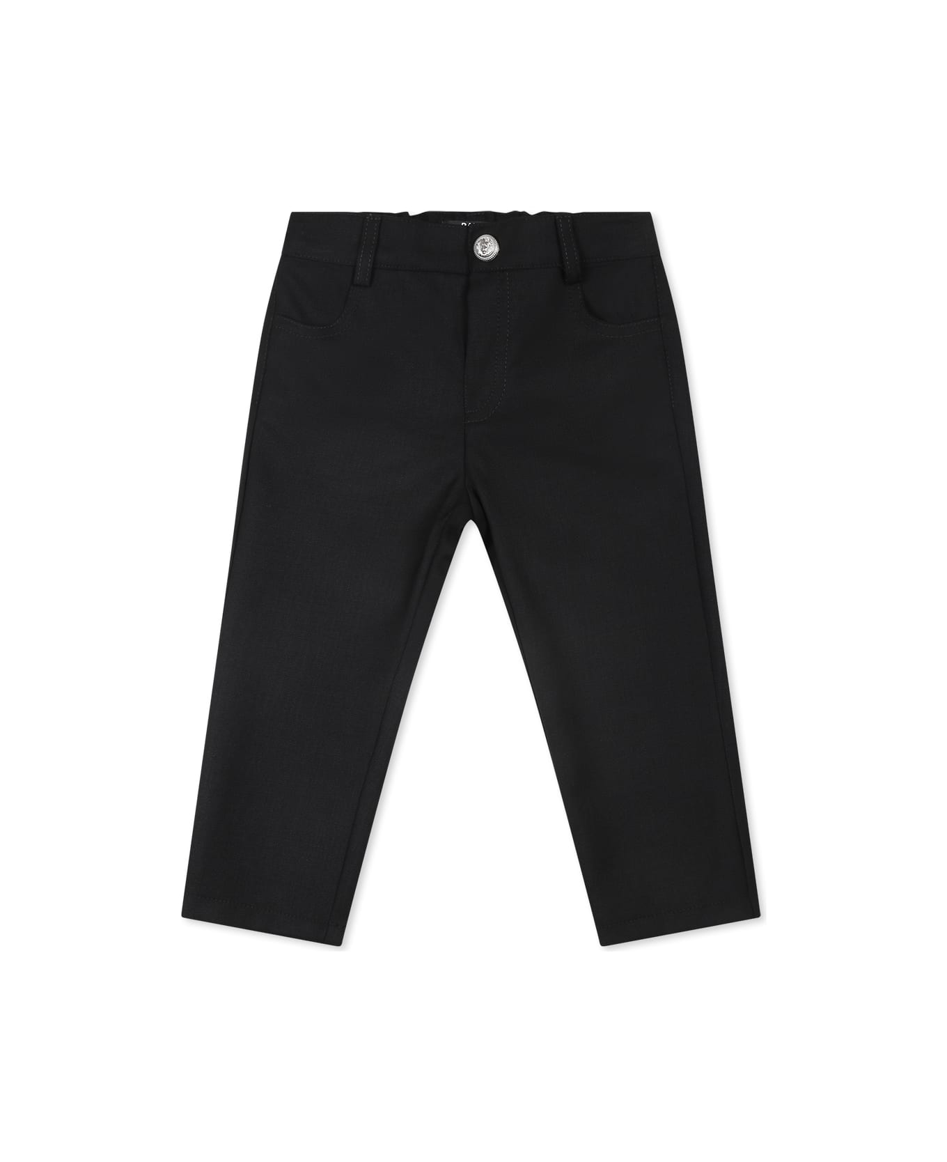 Elegant black trousers in wool blend, with belt loops, front button closure, adjustable waist thanks to internal elastic with buttons, side pockets and patch pockets on the back. They are embellished with iconic silver button on the front and logoed patch on the back.
