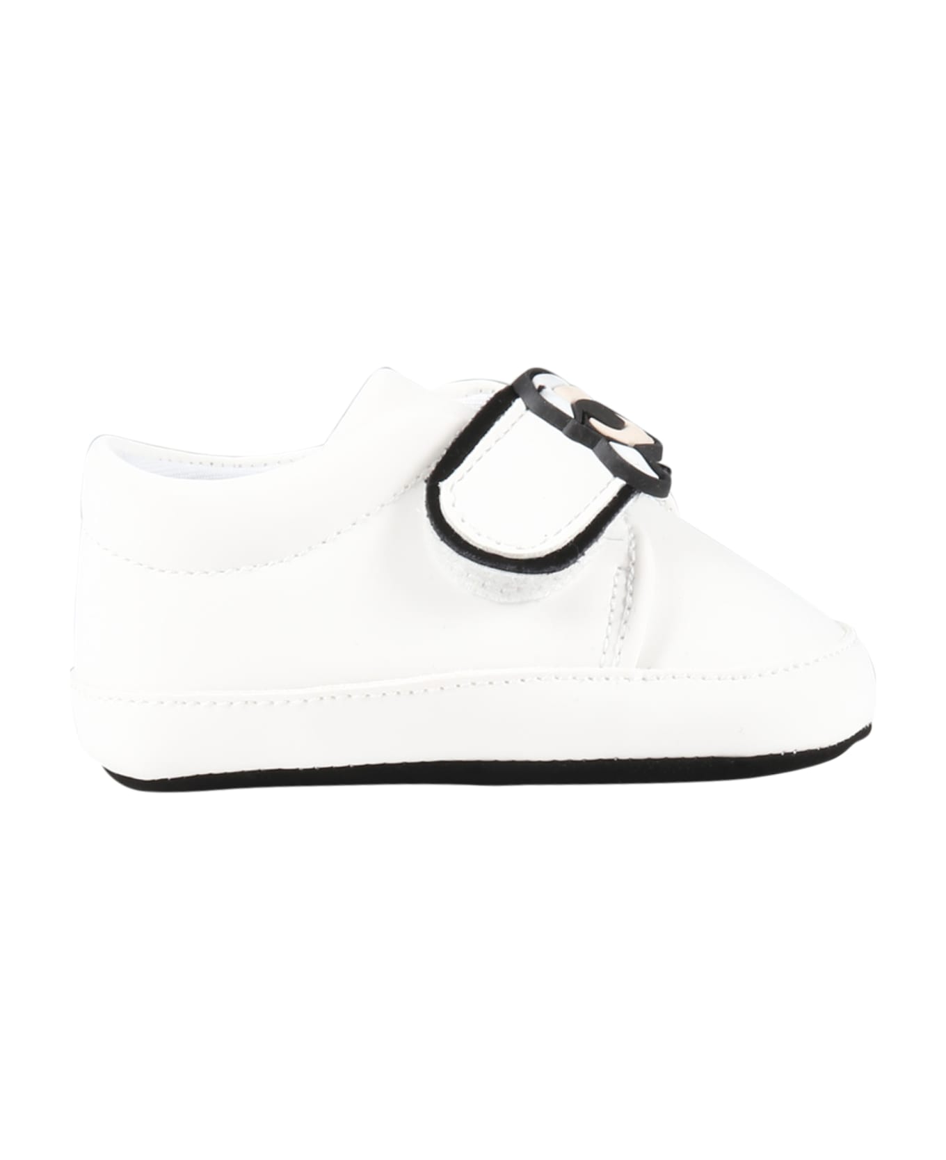 White crib shoes with Velcro fastening on top. They are embellished with Karl Lagerfeld shaped patch on the front.