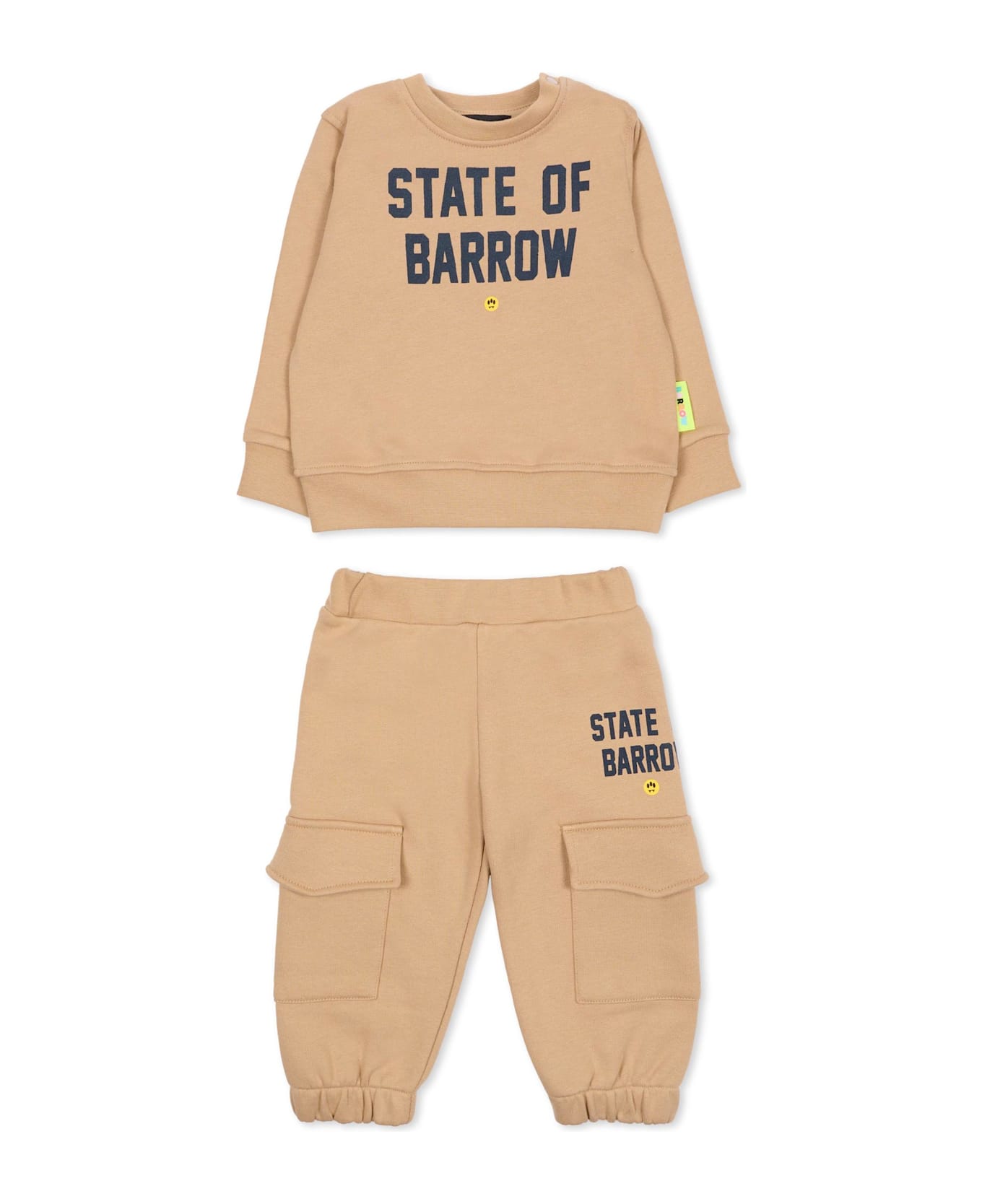 Beige cotton suit composed of sweatshirt and trousers. The long-sleeved sweatshirt features a crew neck, ribbed cuffs and hem, and snap button closure at the shoulder. It is embellished with a Bear print on the back and writing on the front. Trousers with elasticated waist, cargo pockets on the sides and elasticated ankles; they are dembellished with writing on a leg.