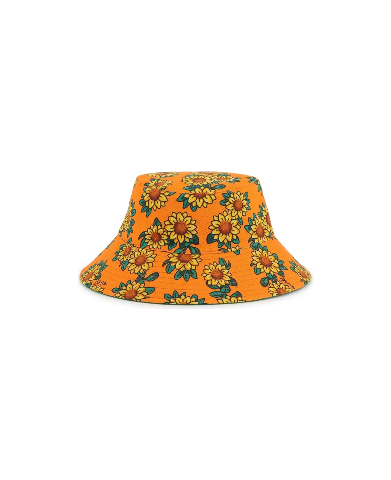 cotone design reversibile orlo trapuntato tesa larga bassa corona piattaLato anteriore verde ricamo con logo frontaleLato posteriore arancione/multicolore stampa con fiori all-over